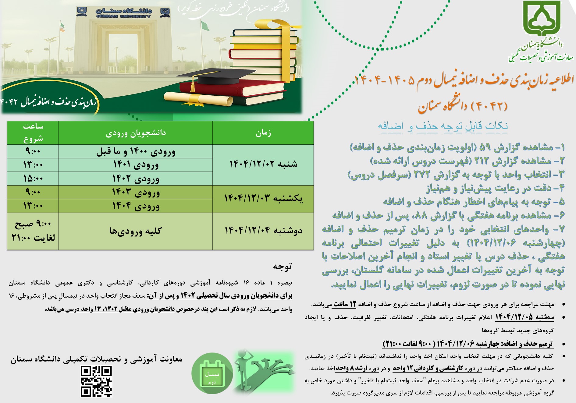 اطلاعیه زمانبندی حذف و اضافه نیمسال دوم 1405 1404 (4042) دانشگاه سمنان 1404/11/29 - 17:08 تعداد بازدید: 27 کلمات کلیدی