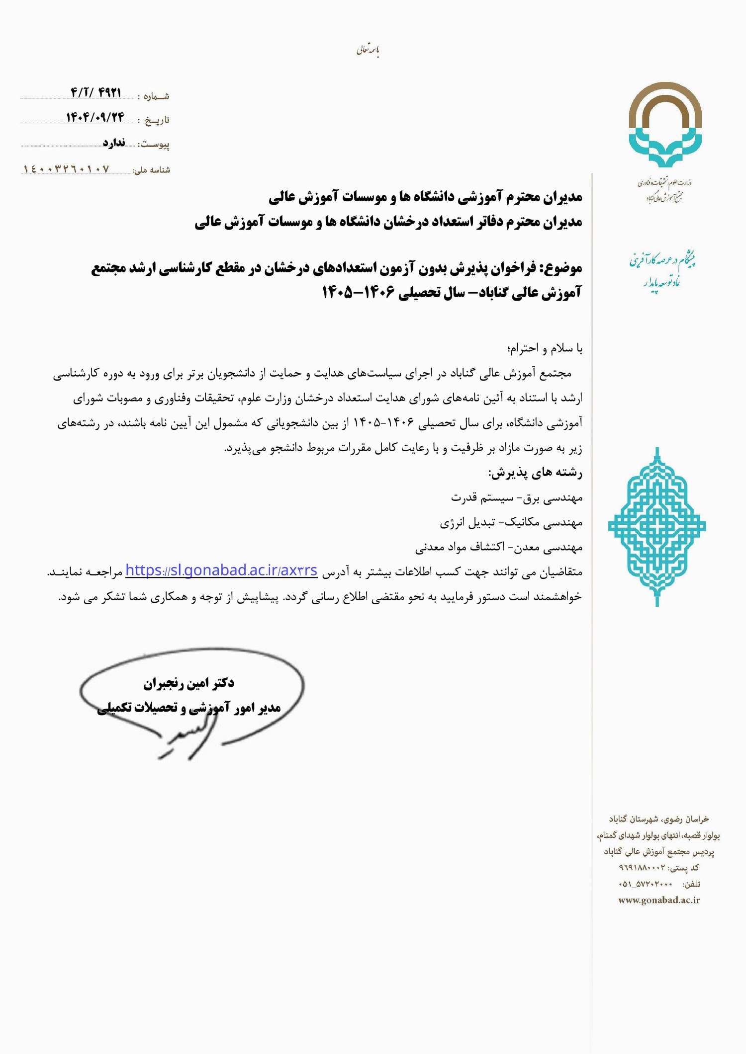 - فراخوان پذیرش بدون آزمون مقطع کارشناسی ارشد مجتمع آموزش عالی گناباد برای سال تحصیلی ۰۶-۱۴۰۵
