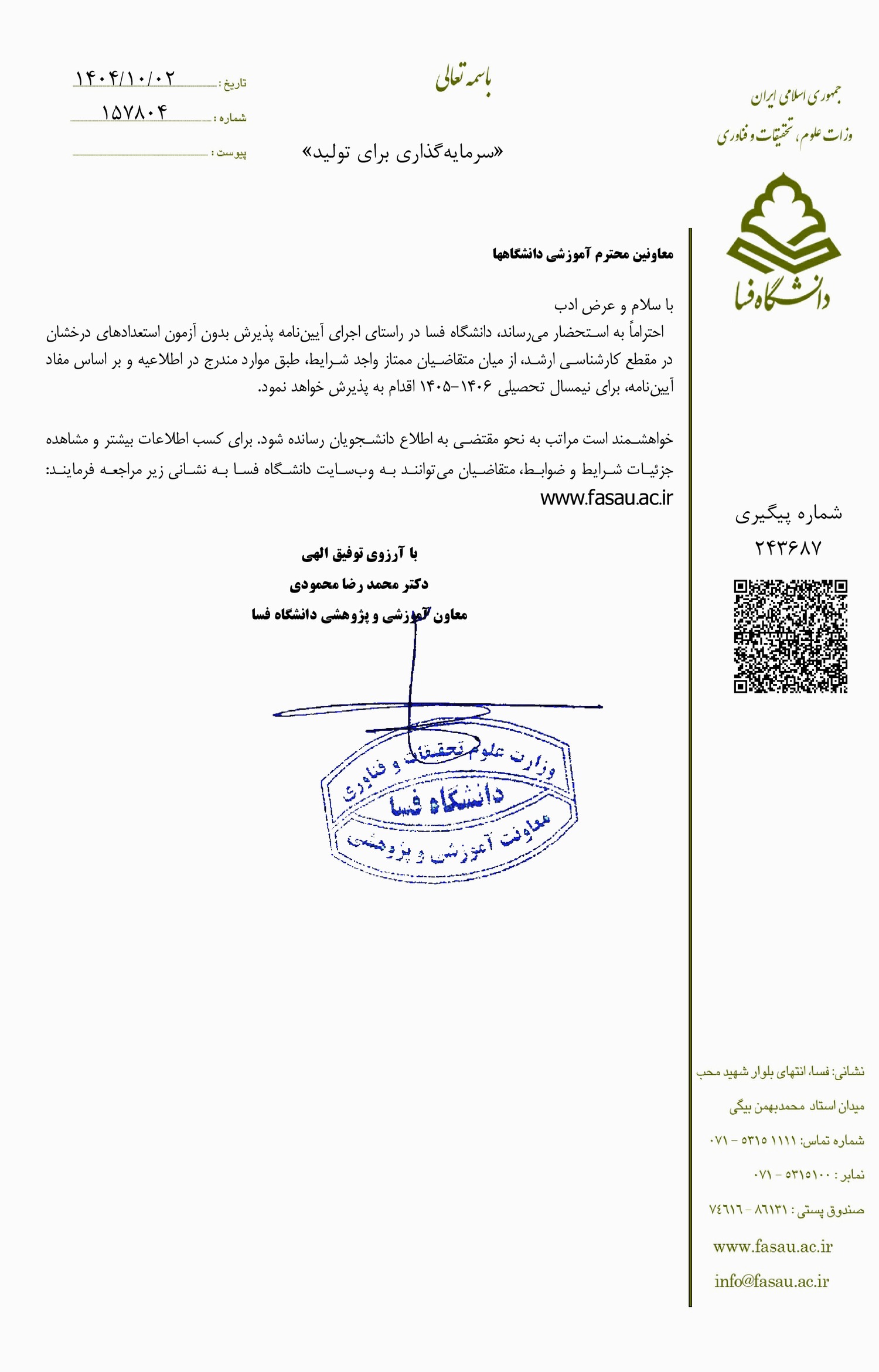 - فراخوان پذیرش بدون آزمون مقطع کارشناسی ارشد دانشگاه فسا برای سال تحصیلی ۰۵-۱۴۰۴