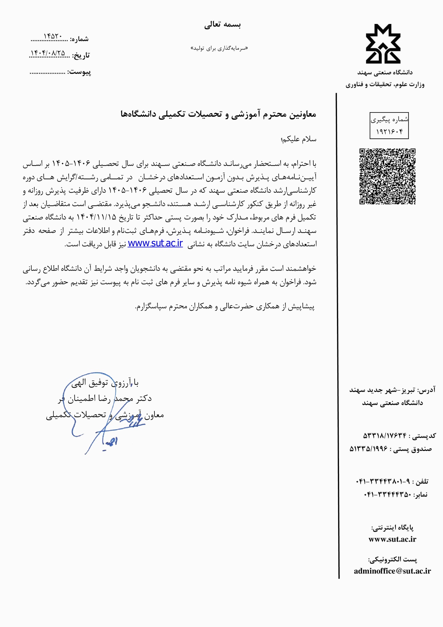- فراخوان پذیرش بدون آزمون مقطع کارشناسی ارشد دانشگاه صنعتی سهند برای سال تحصیلی ۰۶-۱۴۰۵