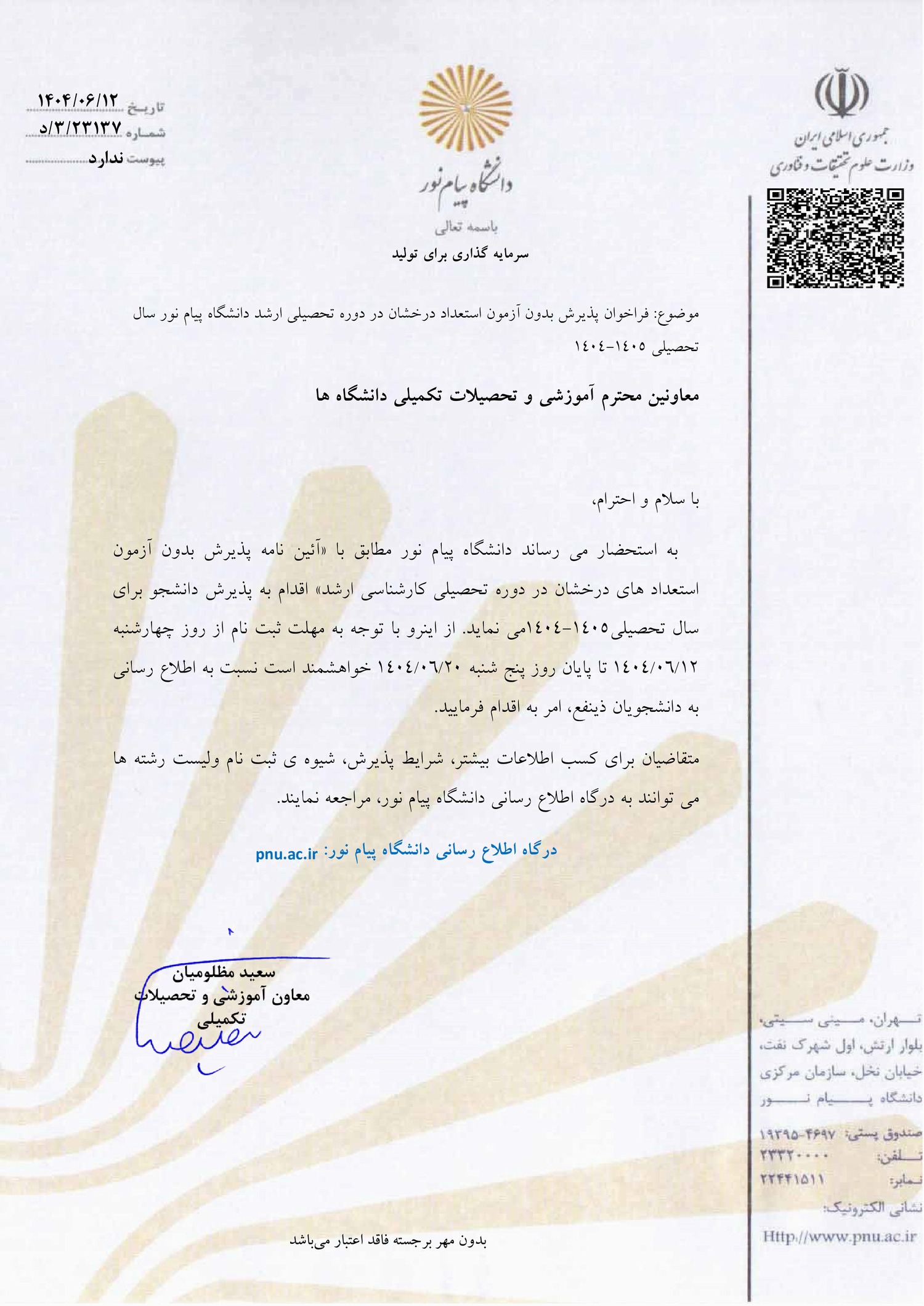 - فراخوان پذیرش بدون آزمون مقطع کارشناسی ارشد دانشگاه پیام نور برای سال تحصیلی ۰۵-۱۴۰۴