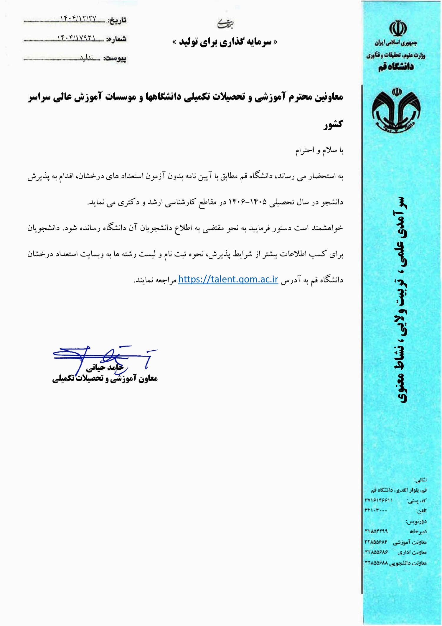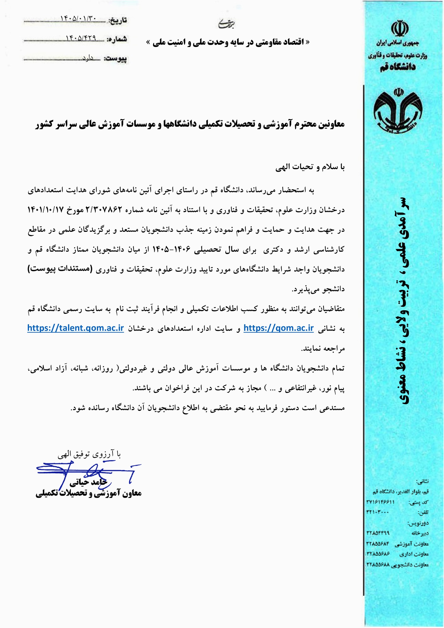 - فراخوان پذیرش بدون آزمون مقطع کارشناسی ارشد و دکتری دانشگاه قم برای سال تحصیلی ۰۶-۱۴۰۵