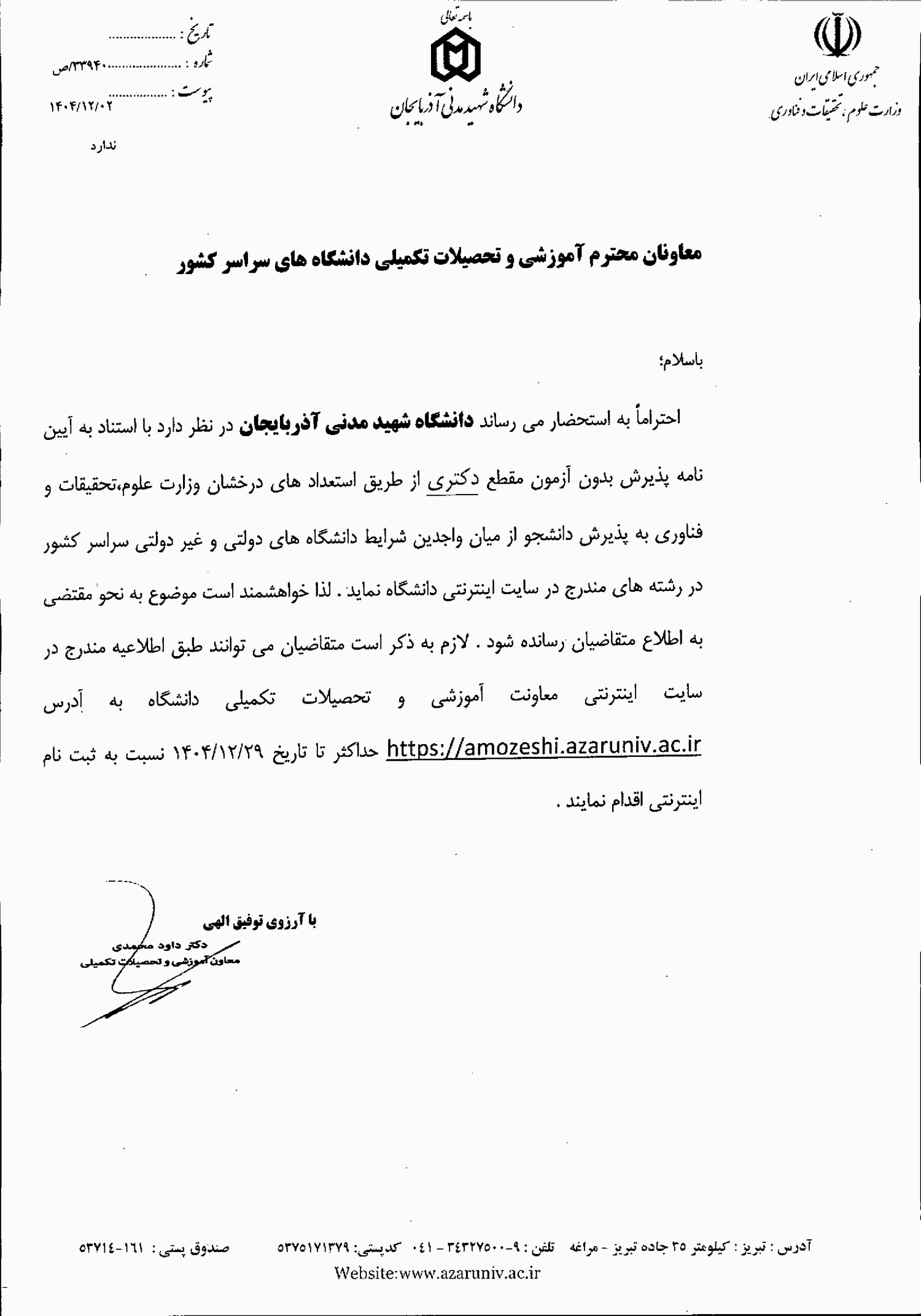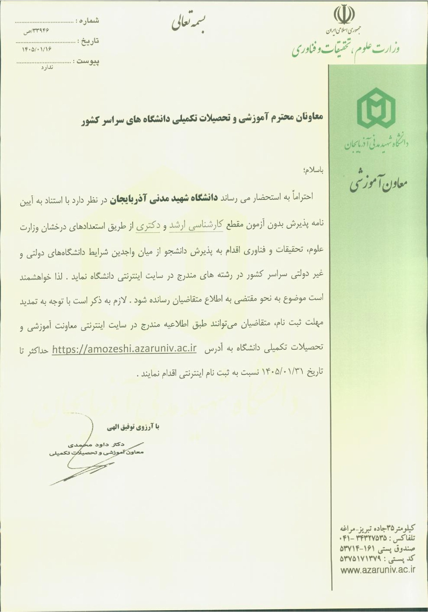 - فراخوان پذیرش بدون آزمون مقطع کارشناسی ارشد و دکتری دانشگاه شهید مدنی آذربایجان برای سال تحصیلی ۰۶-۱۴۰۵