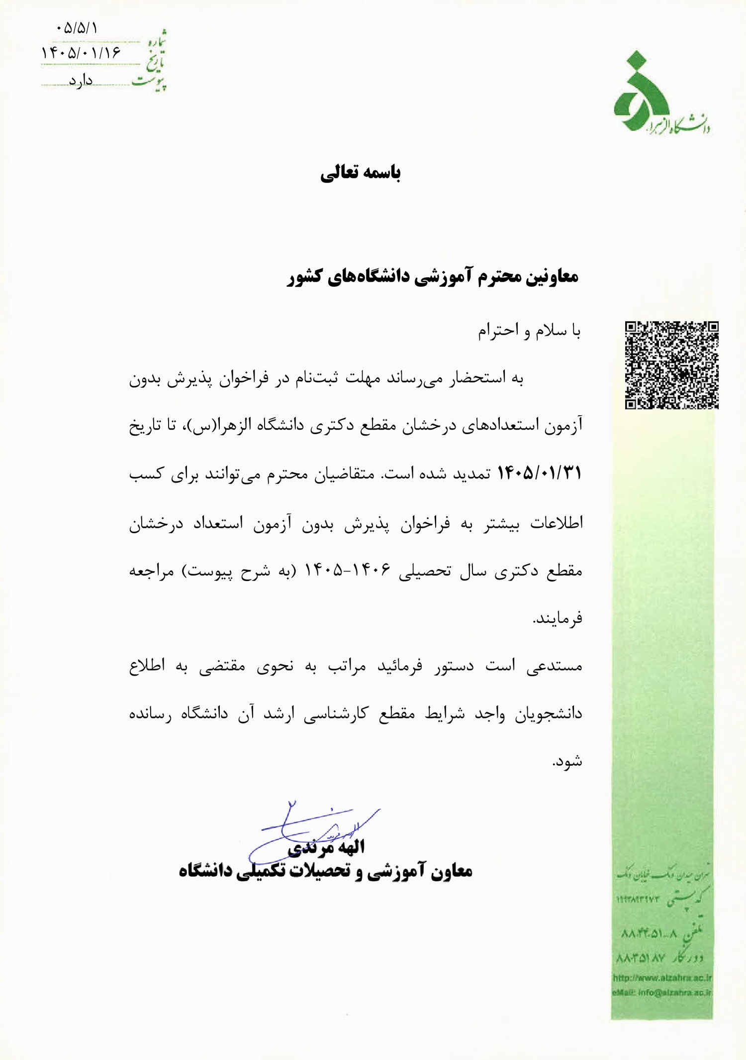 - تمدید فراخوان پذیرش بدون آزمون مقطع کارشناسی ارشد و دکتری دانشگاه الزهرا برای سال تحصیلی ۰۶-۱۴۰۵