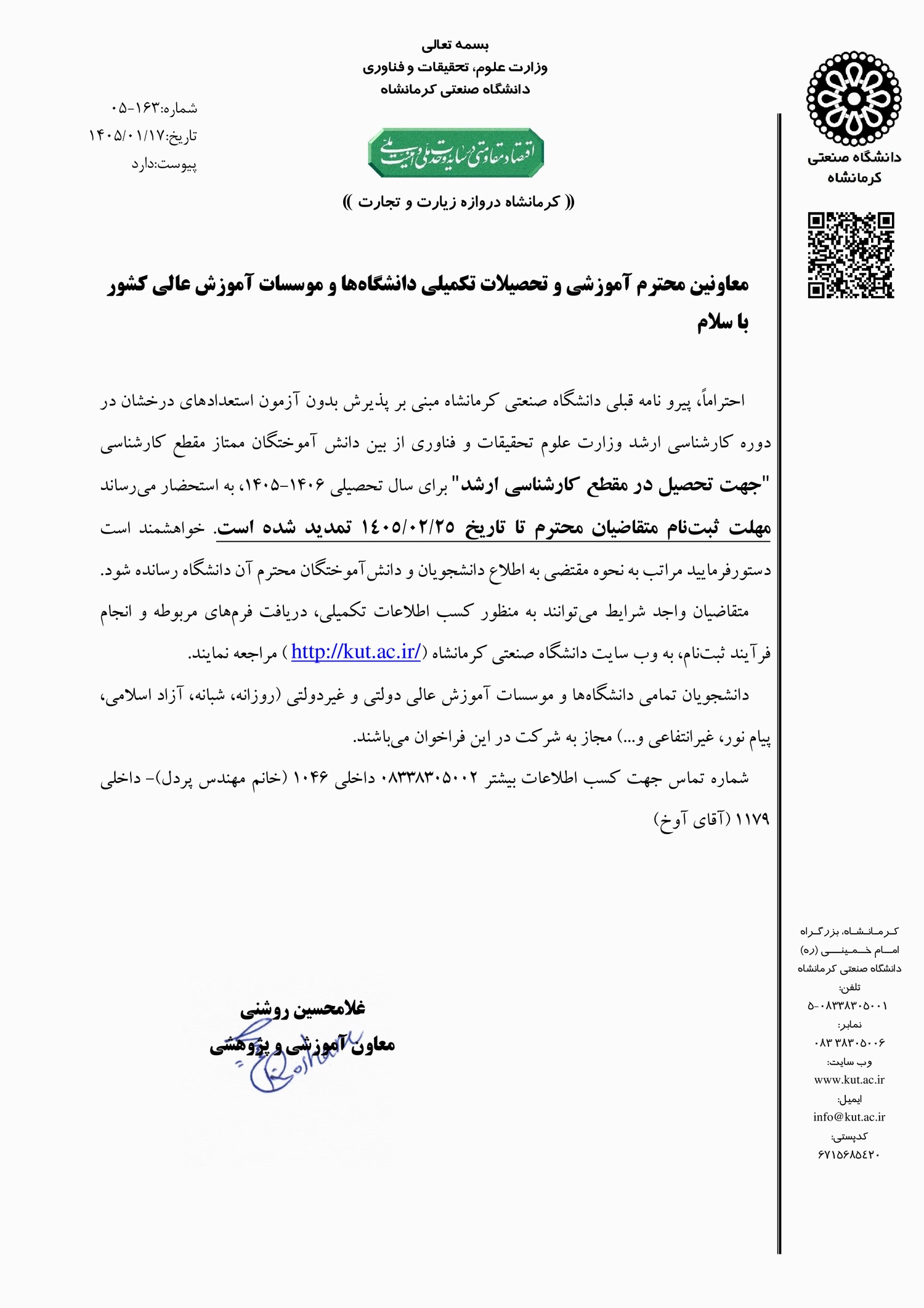 - فراخوان پذیرش بدون آزمون مقطع کارشناسی ارشد دانشگاه صنعتی کرمانشاه برای سال تحصیلی ۰۶-۱۴۰۵