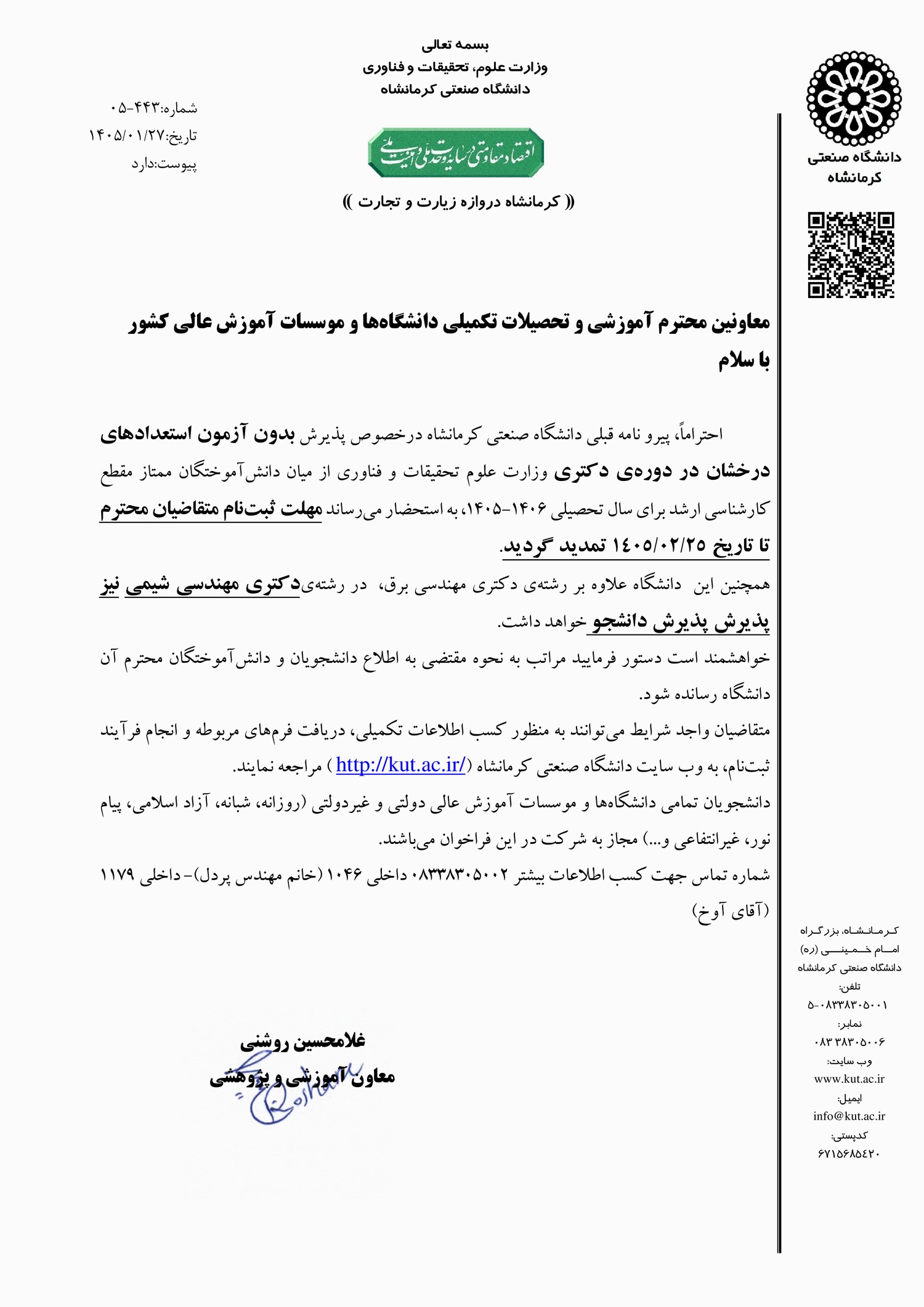 - تمدید فراخوان پذیرش بدون آزمون مقطع دکتری دانشگاه صنعتی کرمانشاه برای سال تحصیلی ۰۶-۱۴۰۵