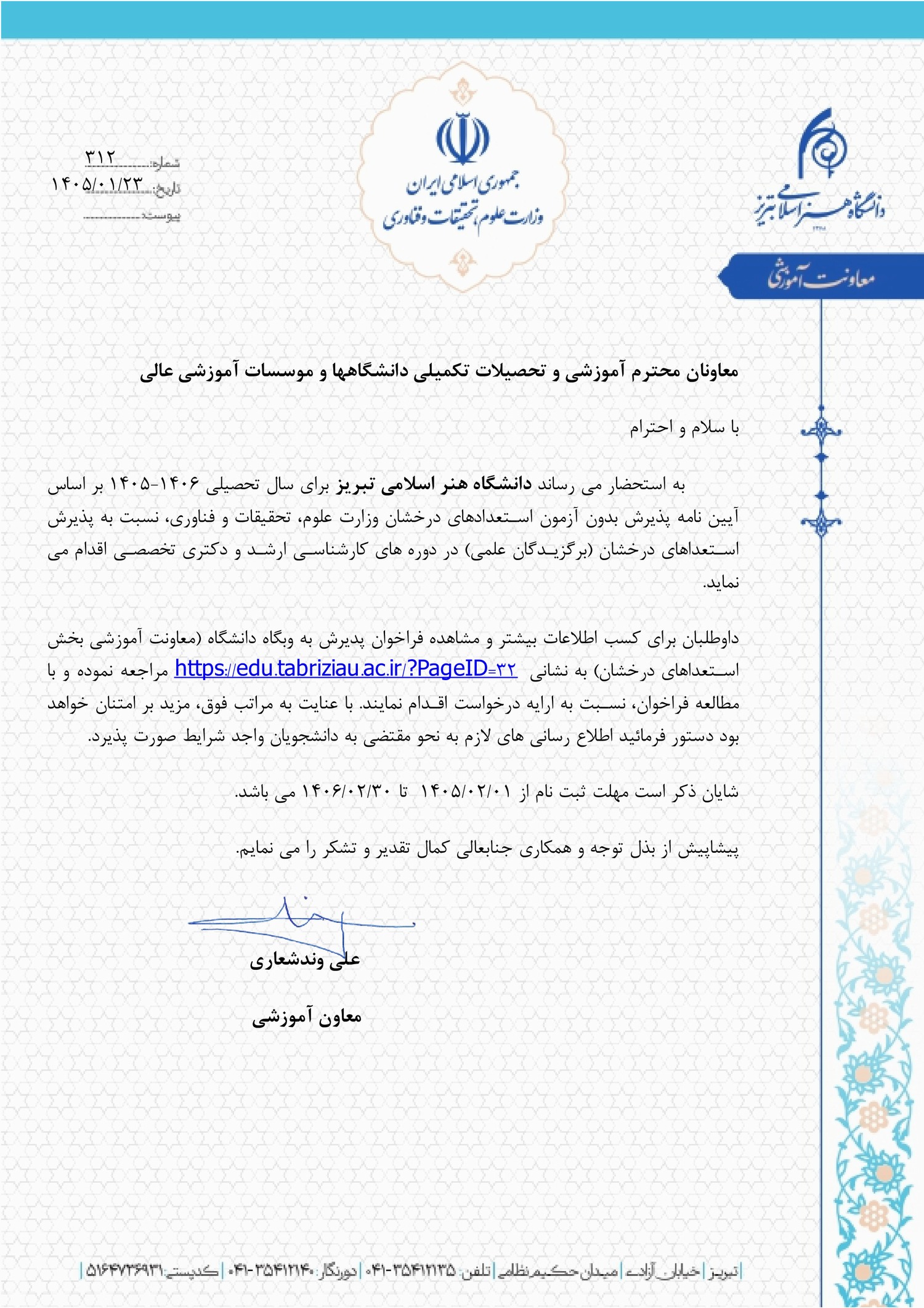 - فراخوان پذیرش بدون آزمون مقطع کارشناسی ارشد و دکتری دانشگاه هنر اسلامی تبریز برای سال تحصیلی ۰۶-۱۴۰۵