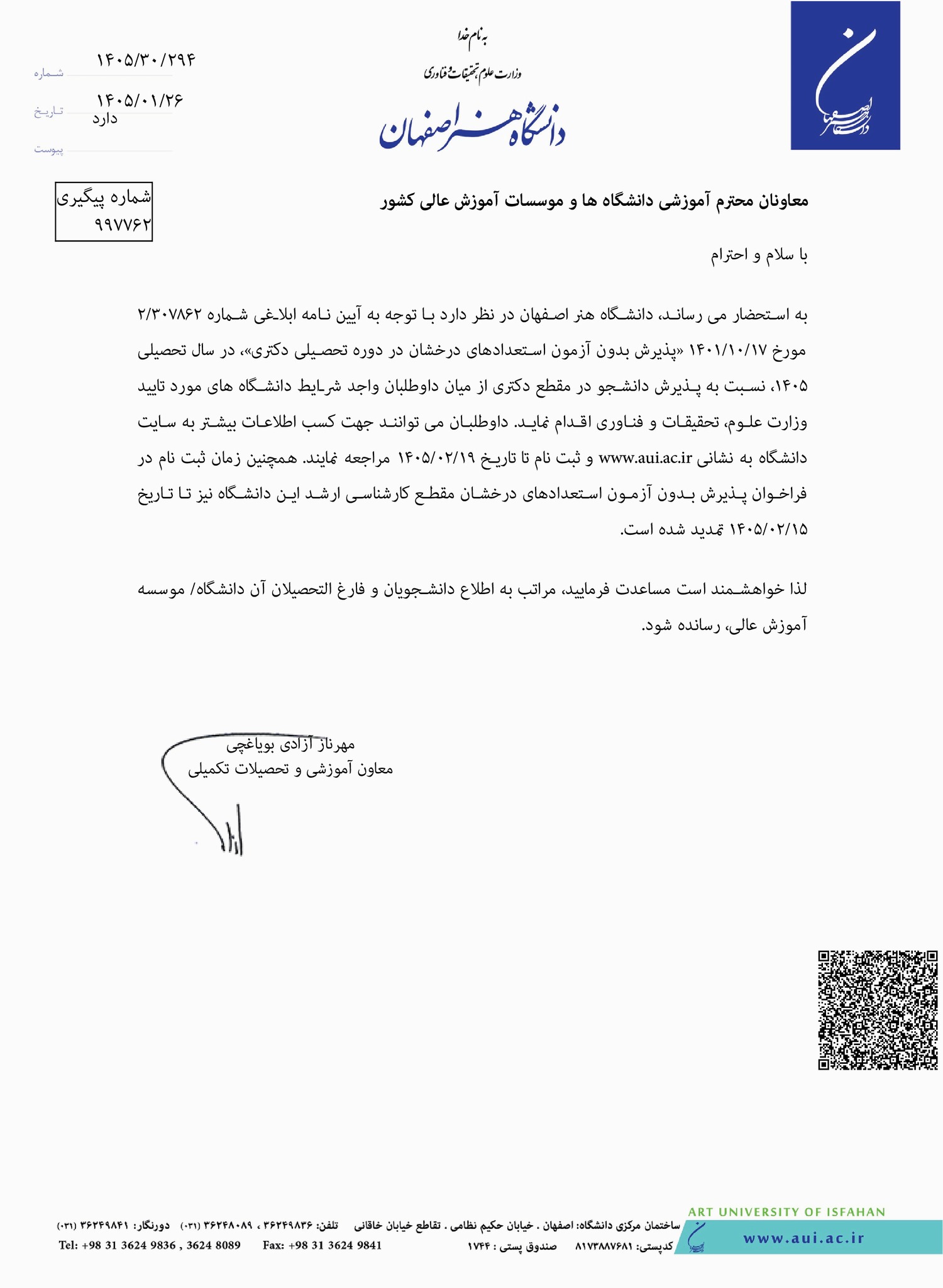 - تمدید فراخوان پذیرش بدون آزمون مقطع کارشناسی ارشد و دکتری دانشگاه هنر اصفهان برای سال تحصیلی ۰۶-۱۴۰۵
