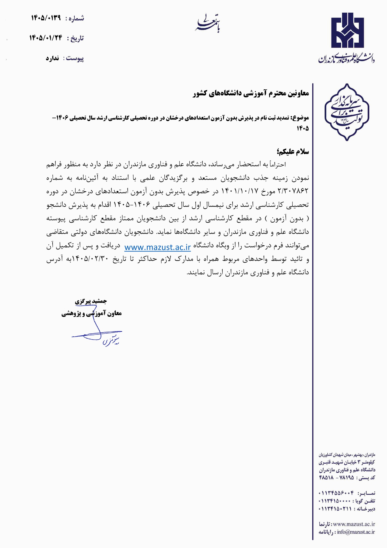 - فراخوان پذیرش بدون آزمون مقطع کارشناسی ارشد دانشگاه علم و فناوری مازندران برای سال تحصیلی ۰۶-۱۴۰۵