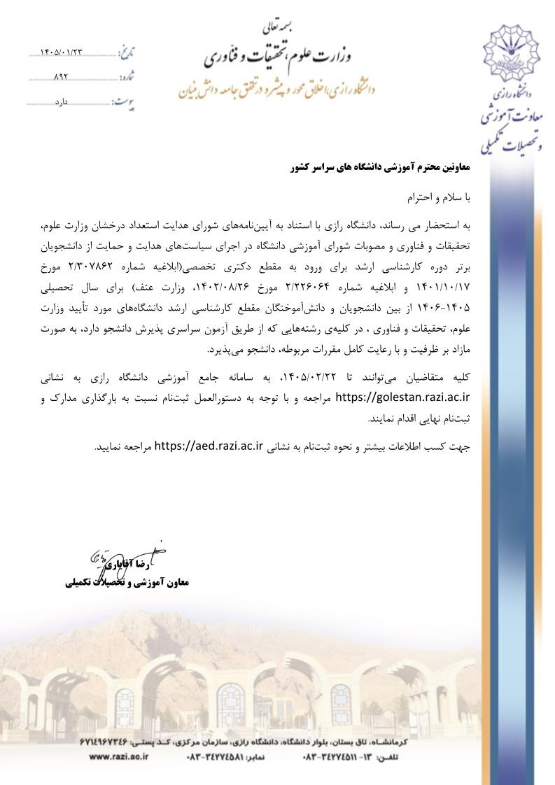 - فراخوان پذیرش بدون آزمون مقطع دکتری دانشگاه رازی کرمانشاه برای سال تحصیلی ۰۶-۱۴۰۵