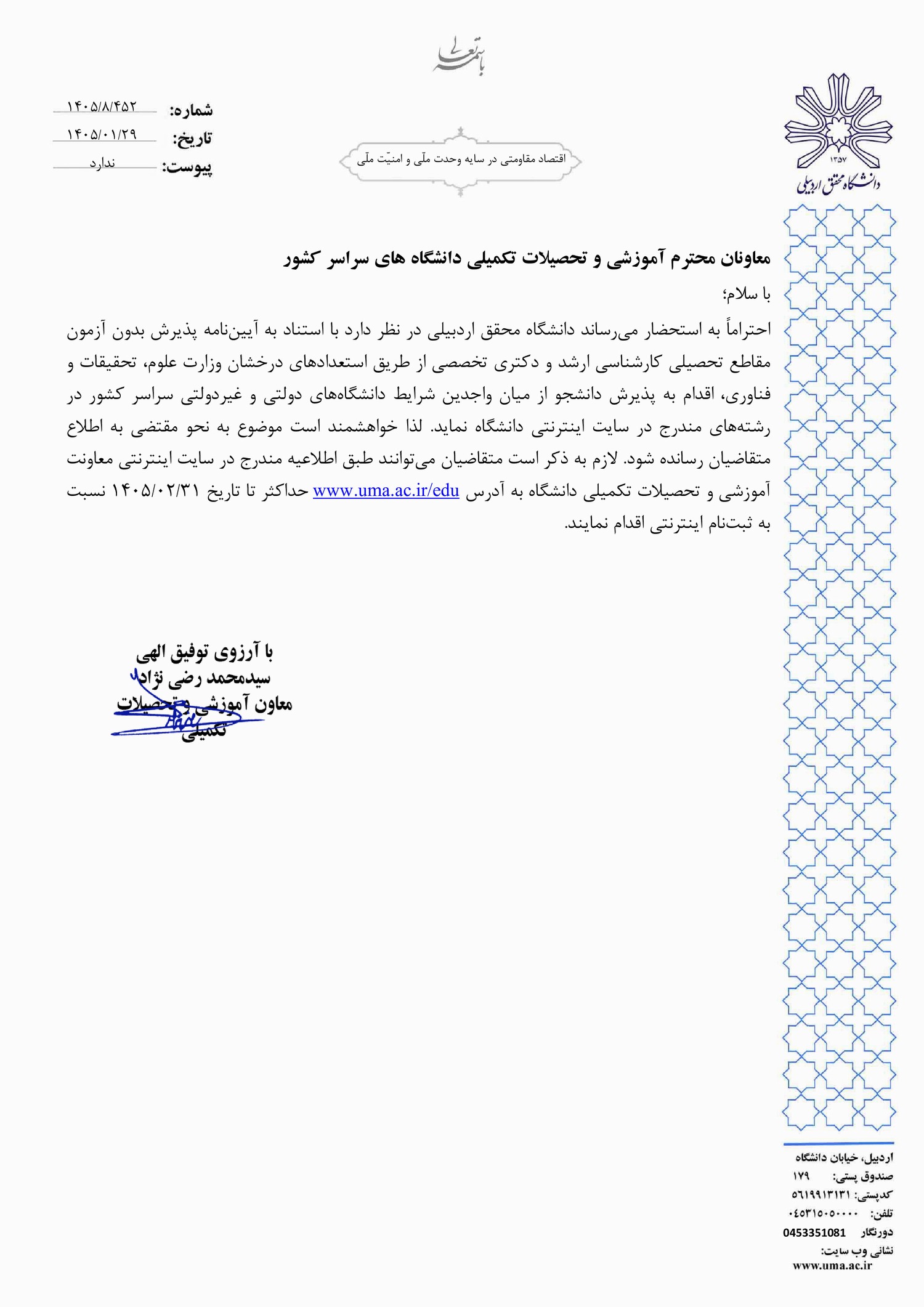 - فراخوان پذیرش بدون آزمون مقطع کارشناسی ارشد و دکتری دانشگاه محقق اردبیلی برای سال تحصیلی ۰۶-۱۴۰۵