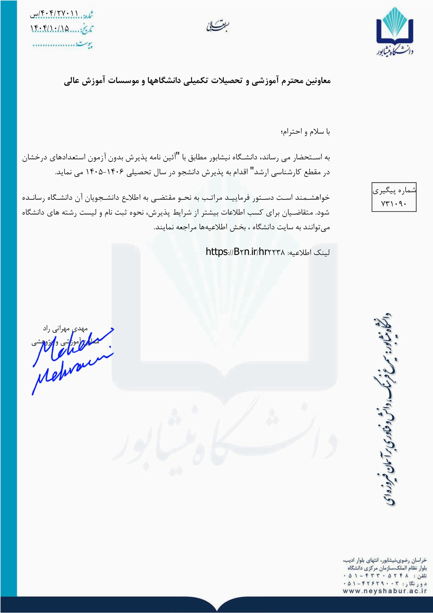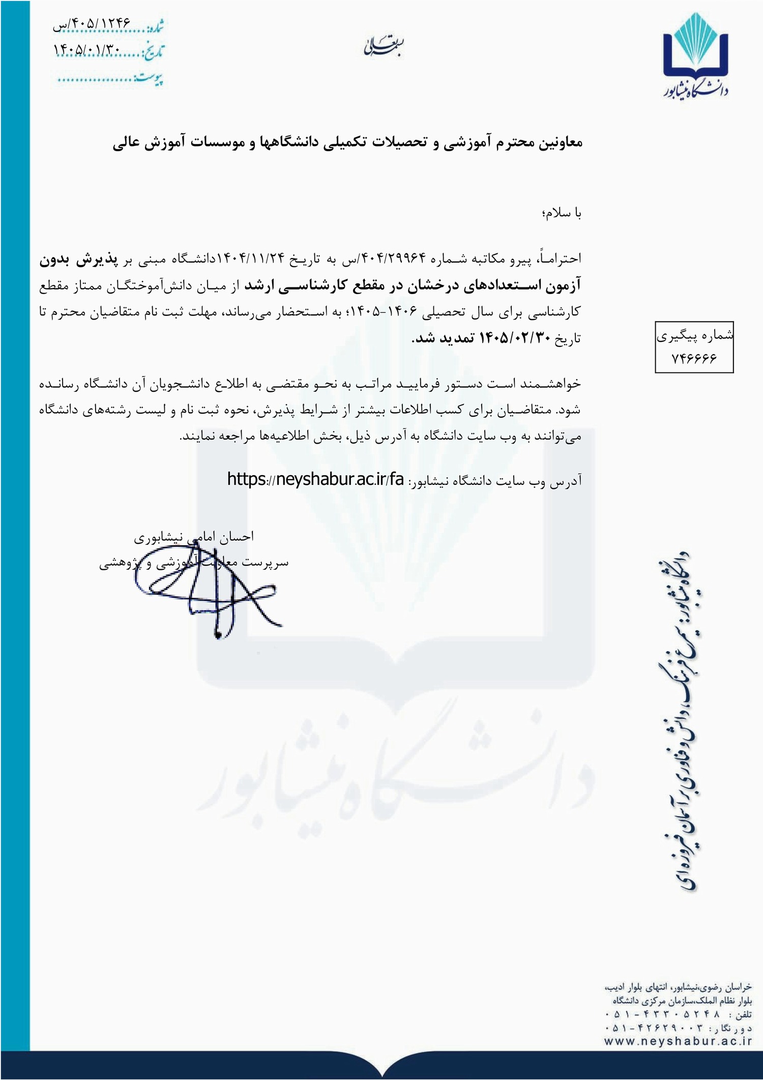 - فراخوان پذیرش بدون آزمون مقطع کارشناسی ارشد دانشگاه نیشابور برای سال تحصیلی ۰۶-۱۴۰۵