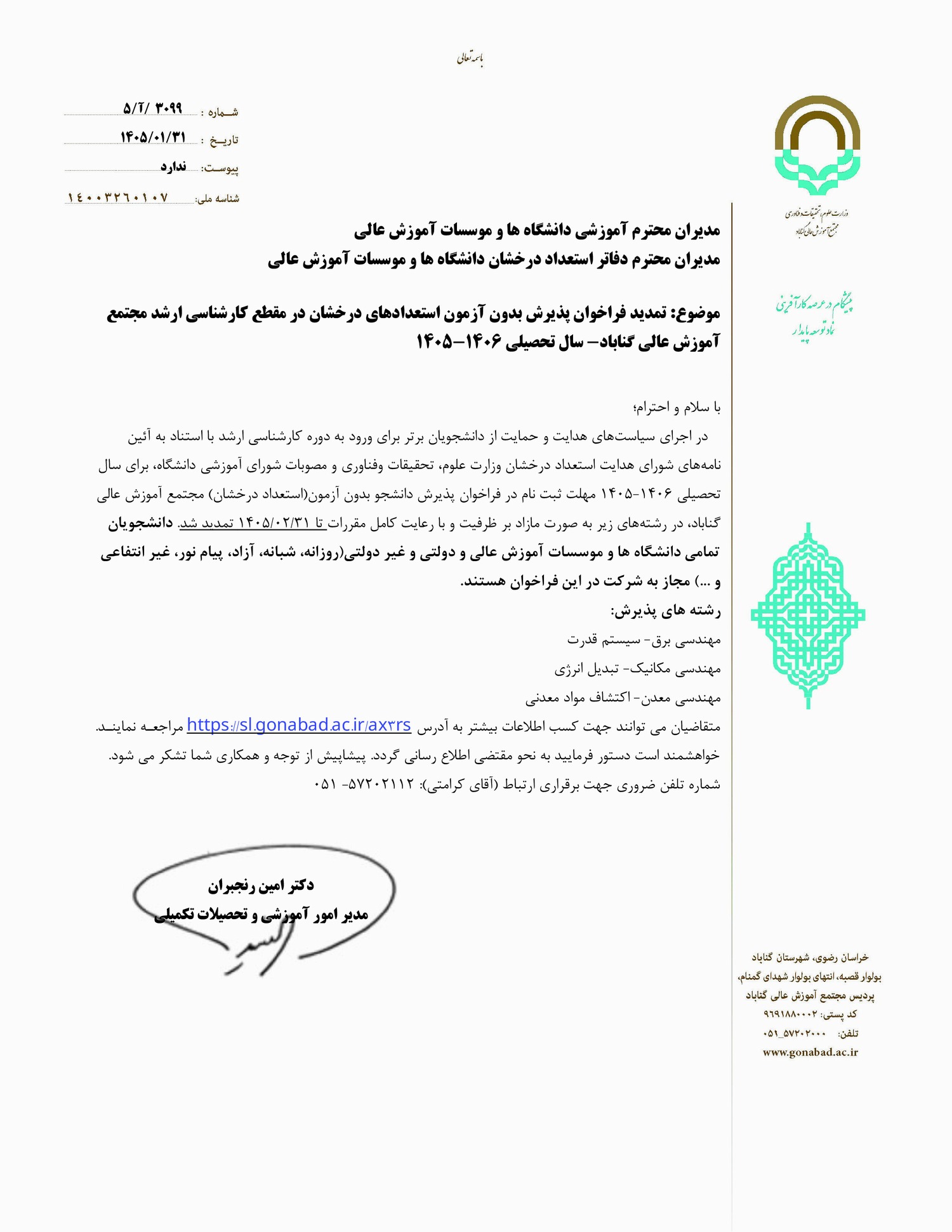 - تمدید فراخوان پذیرش بدون آزمون مقطع کارشناسی ارشد مجتمع آموزش عالی گناباد برای سال تحصیلی ۰۶-۱۴۰۵
