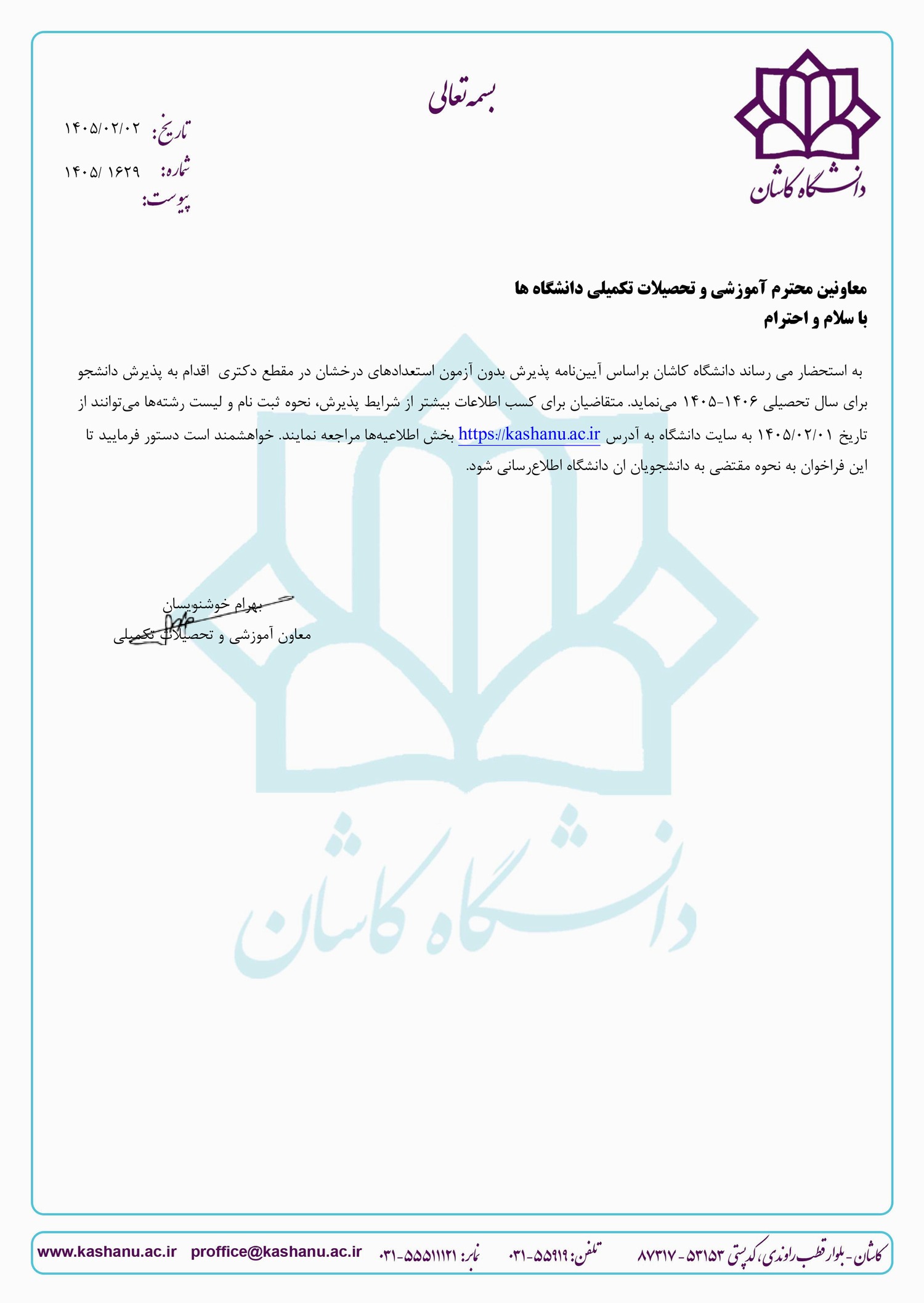- فراخوان پذیرش بدون آزمون مقطع دکتری دانشگاه کاشان برای سال تحصیلی ۰۶-۱۴۰۵