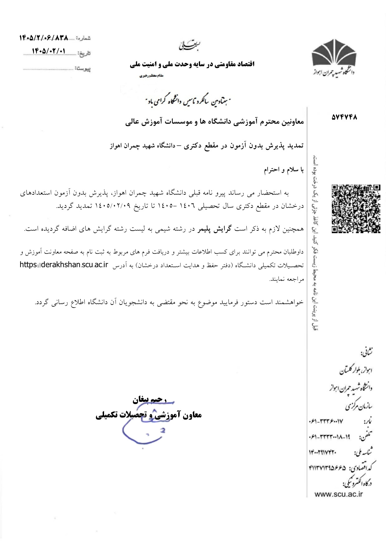 - تمدید فراخوان پذیرش بدون آزمون مقطع دکتری دانشگاه شهید چمران اهواز برای سال تحصیلی ۰۶-۱۴۰۵