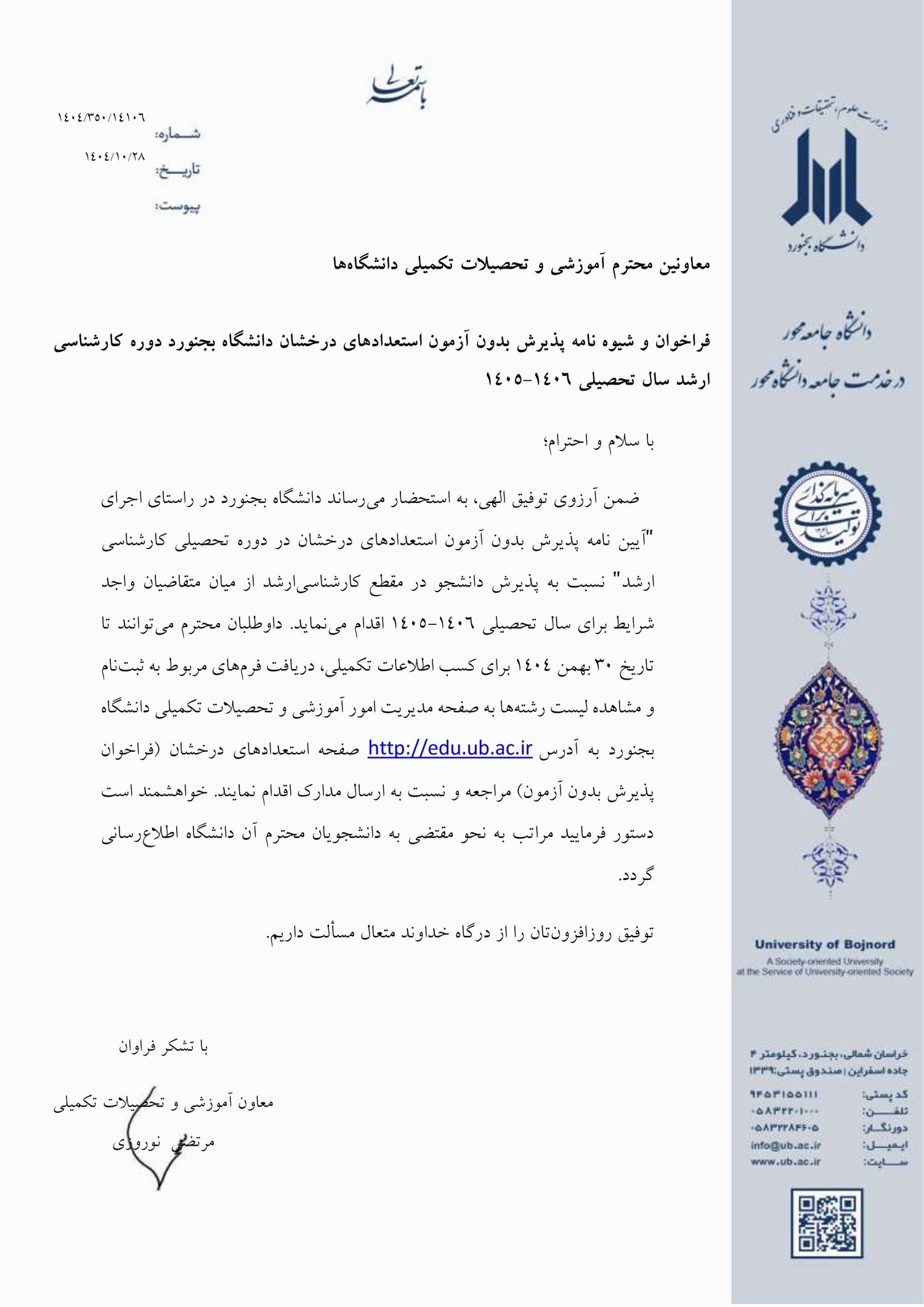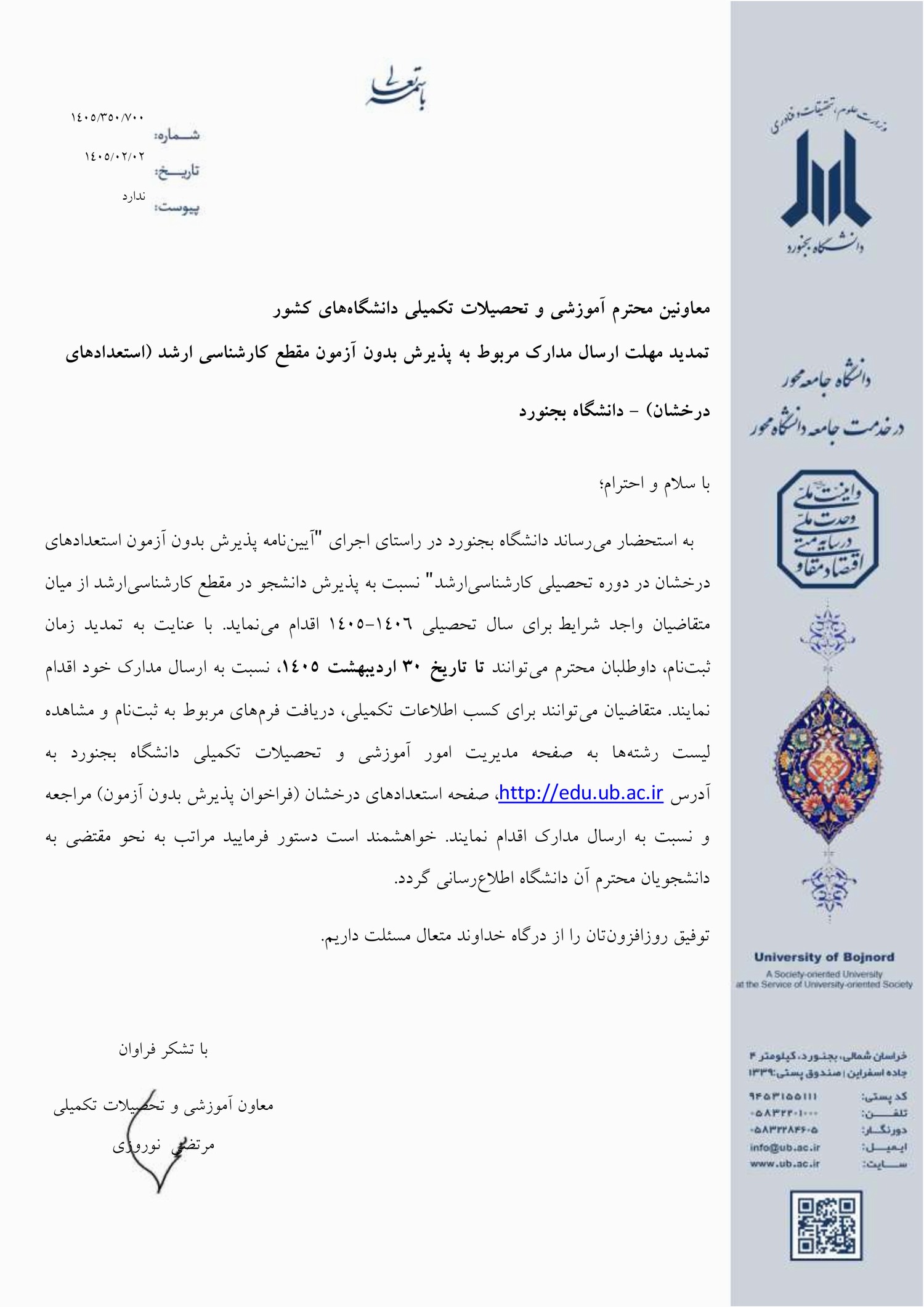 - فراخوان پذیرش بدون آزمون مقطع کارشناسی ارشد دانشگاه بجنورد برای سال تحصیلی ۰۶-۱۴۰۵