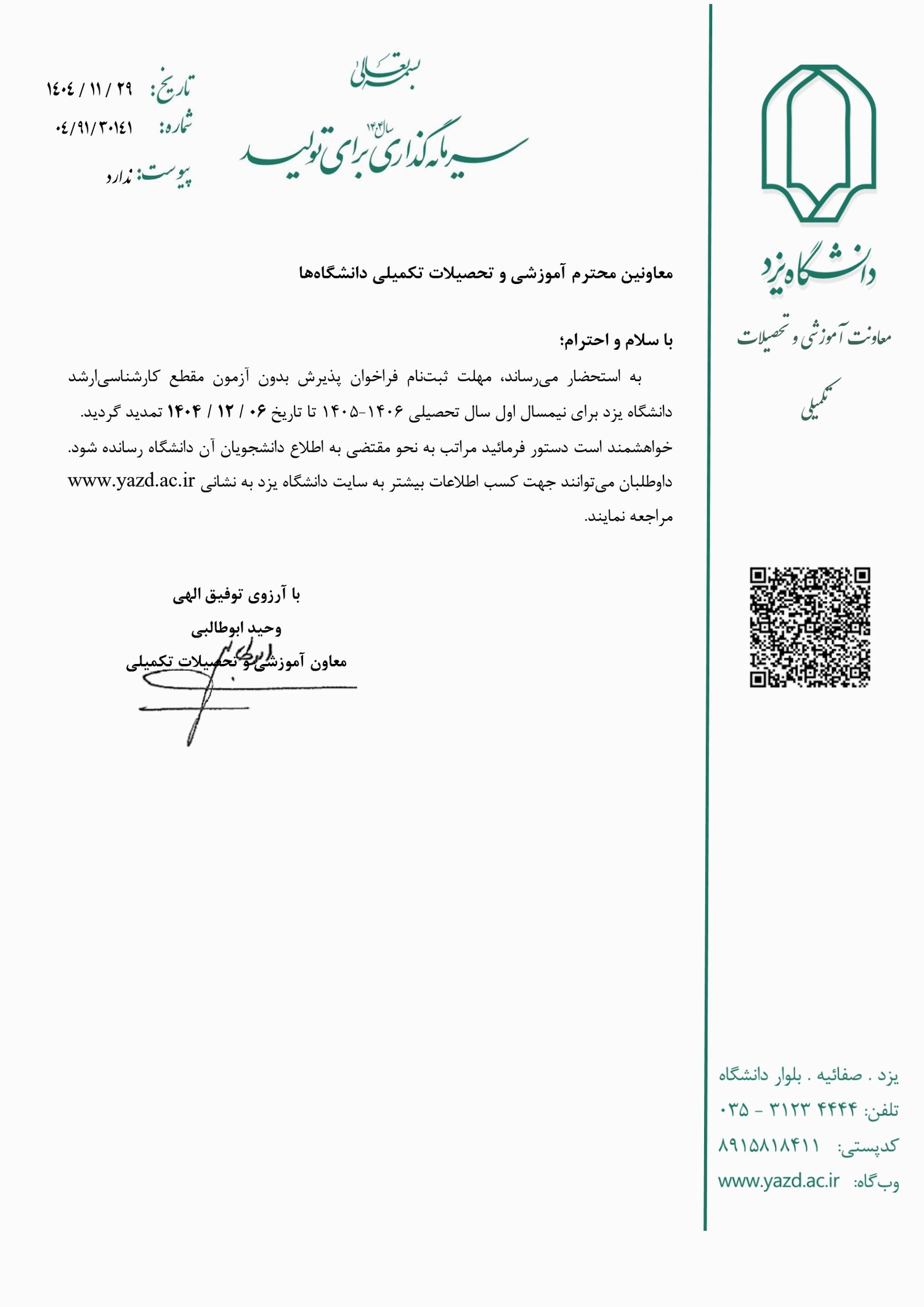 - تمدید فراخوان پذیرش بدون آزمون مقطع کارشناسی ارشد دانشگاه یزد برای سال تحصیلی ۰۶-۱۴۰۵
