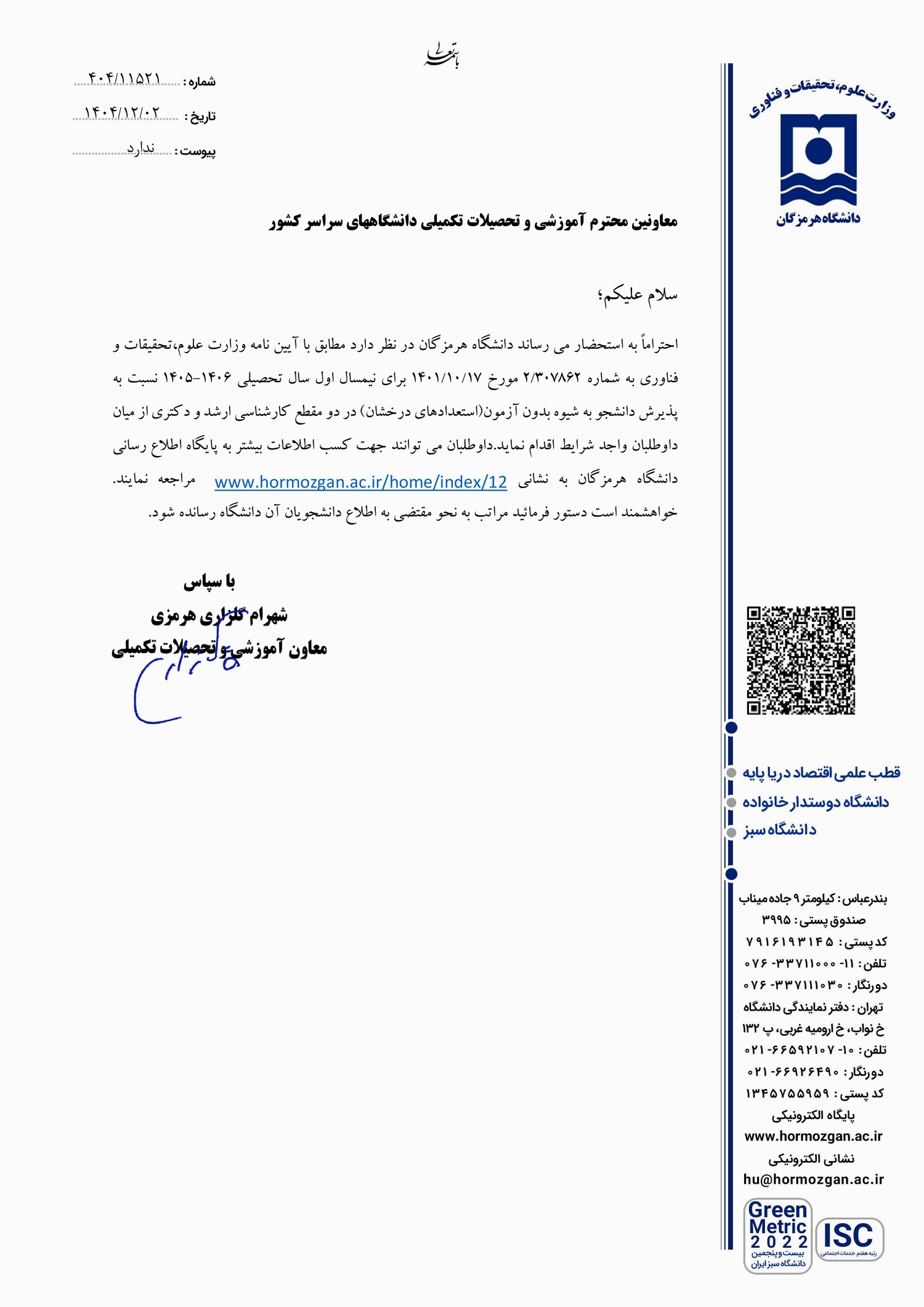 - فراخوان پذیرش بدون آزمون مقطع کارشناسی ارشد و دکتری دانشگاه هرمزگان برای سال تحصیلی ۰۶-۱۴۰۵