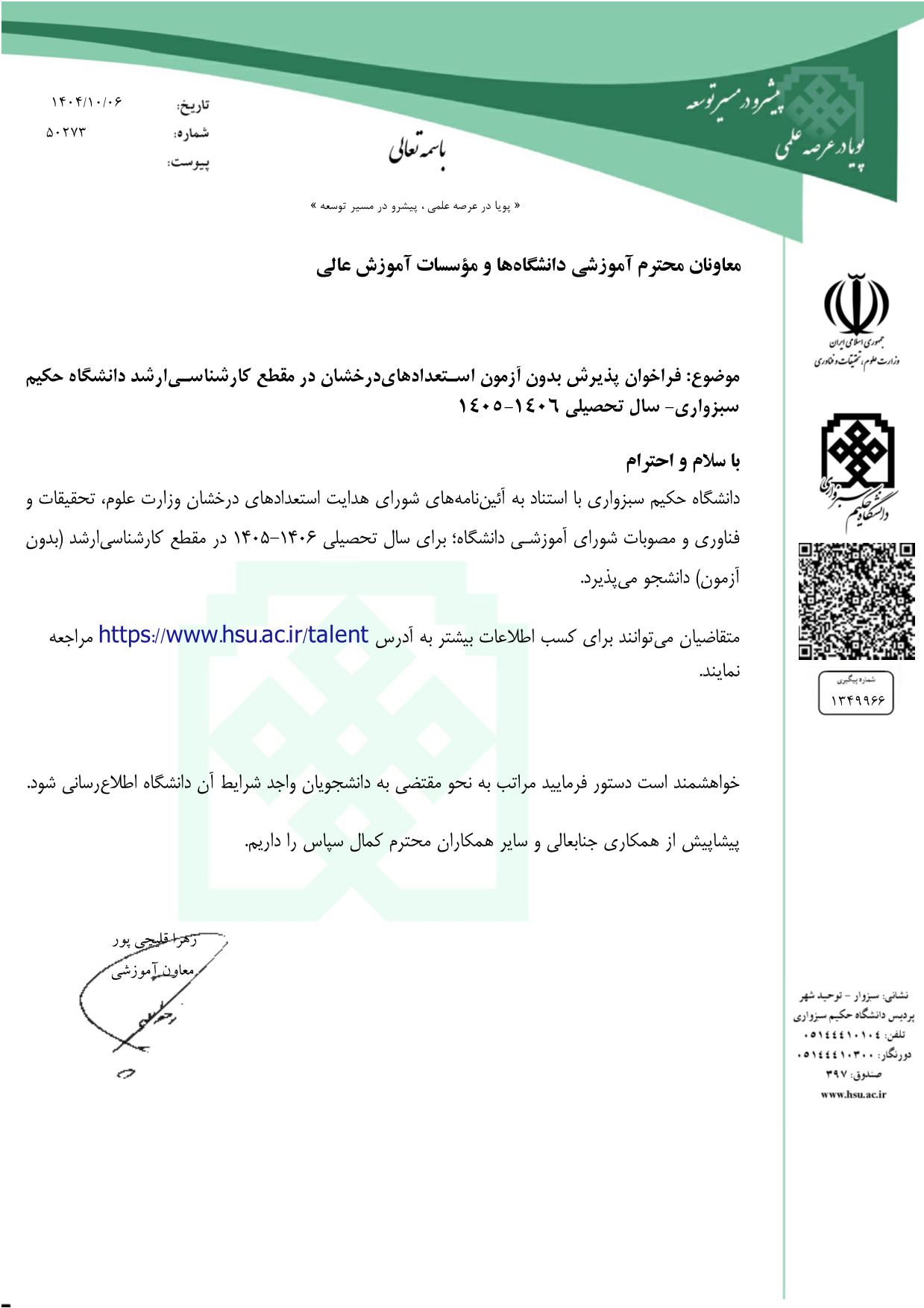 - فراخوان پذیرش بدون آزمون مقطع کارشناسی ارشد دانشگاه حکیم سبزواری برای سال تحصیلی ۰۵-۱۴۰۴