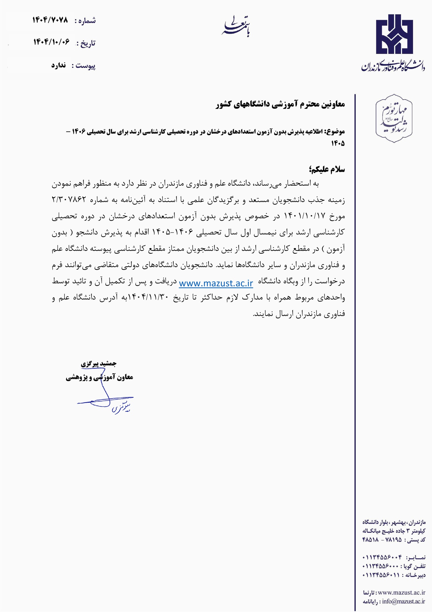 - فراخوان پذیرش بدون آزمون مقطع کارشناسی ارشد دانشگاه علم و فناوری مازندران برای سال تحصیلی ۰۵-۱۴۰۴