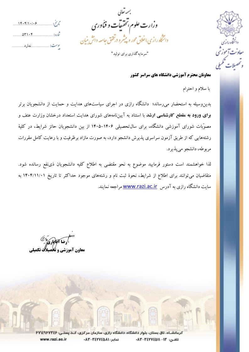 - فراخوان پذیرش بدون آزمون مقطع کارشناسی ارشد دانشگاه رازی کرمانشاه برای سال تحصیلی ۰۶-۱۴۰۵