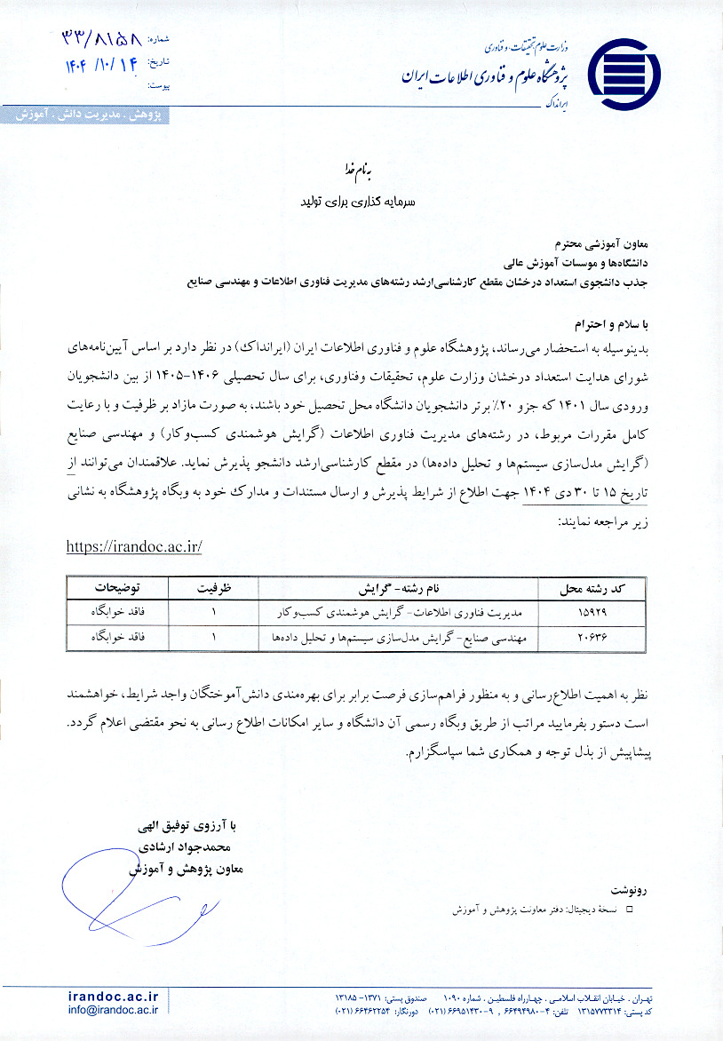 - فراخوان پذیرش بدون آزمون مقطع کارشناسی ارشد پژوهشگاه علوم و فناوری اطلاعات ایران برای سال تحصیلی ۰۶-۱۴۰۵