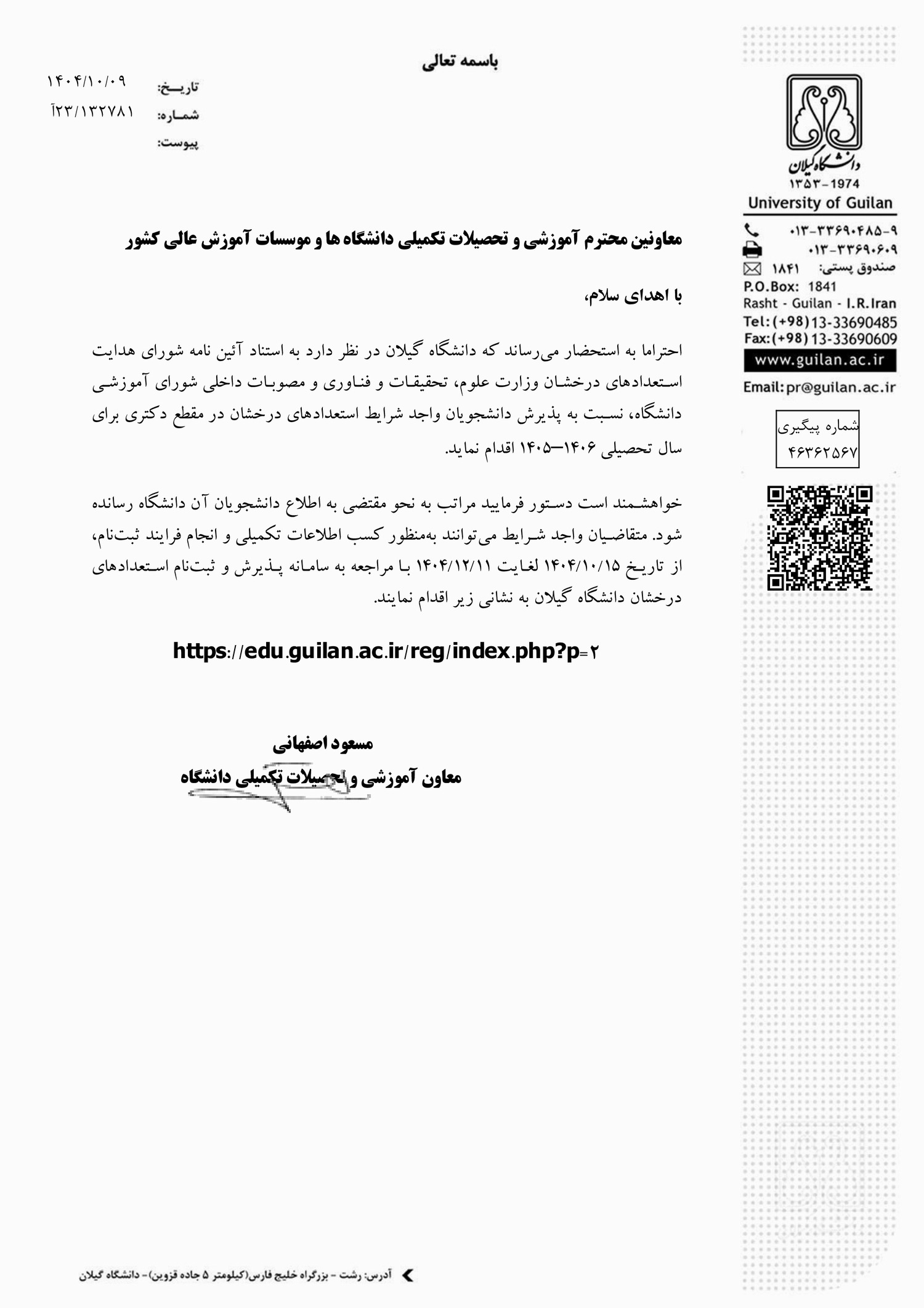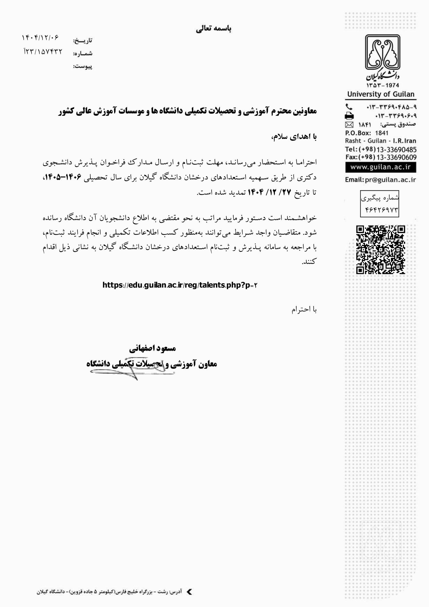 - فراخوان پذیرش بدون آزمون مقطع دکتری دانشگاه گیلان برای سال تحصیلی ۰۶-۱۴۰۵