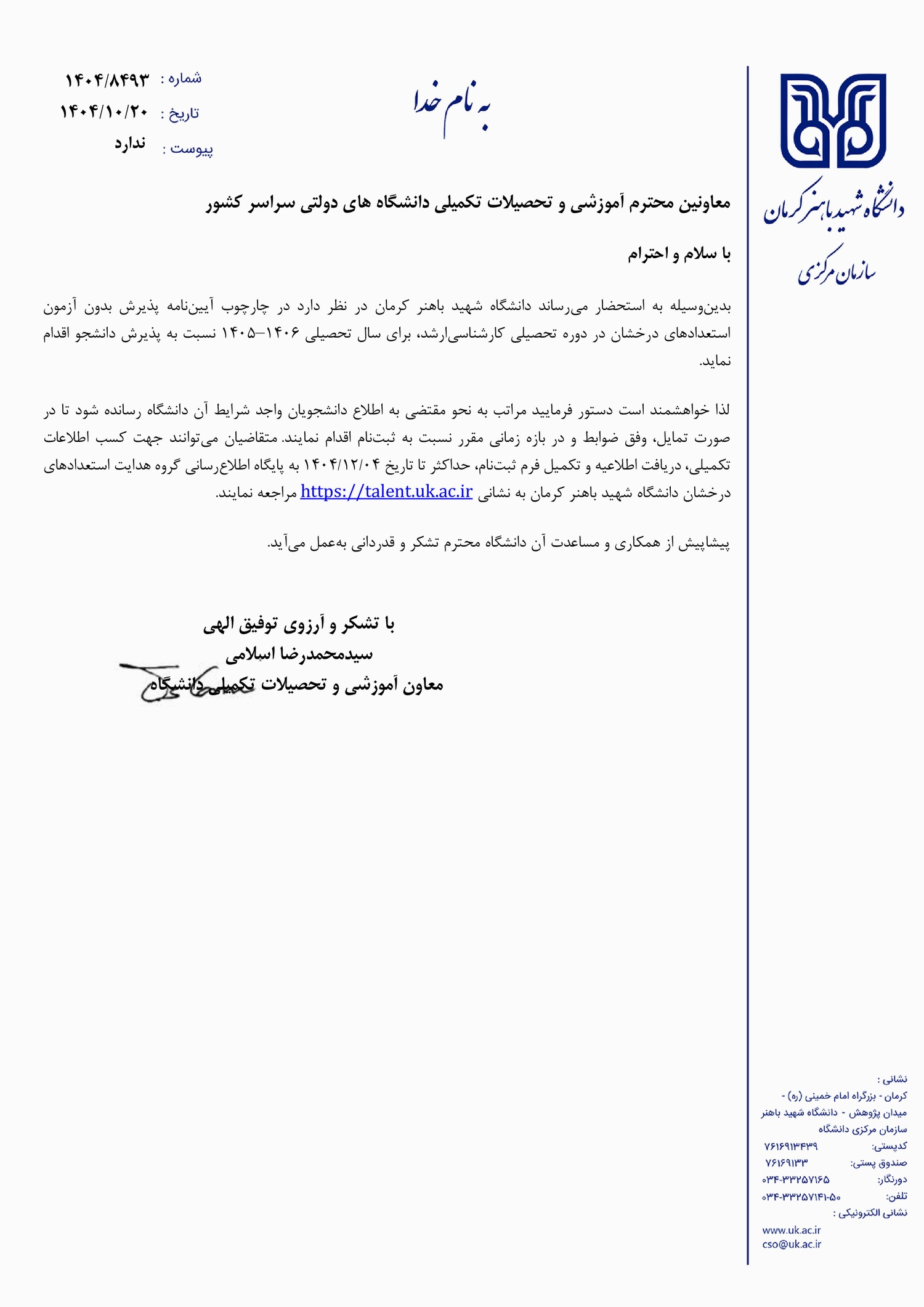 - فراخوان پذیرش بدون آزمون مقطع کارشناسی ارشد دانشگاه باهنر کرمان برای سال تحصیلی ۰۶-۱۴۰۵