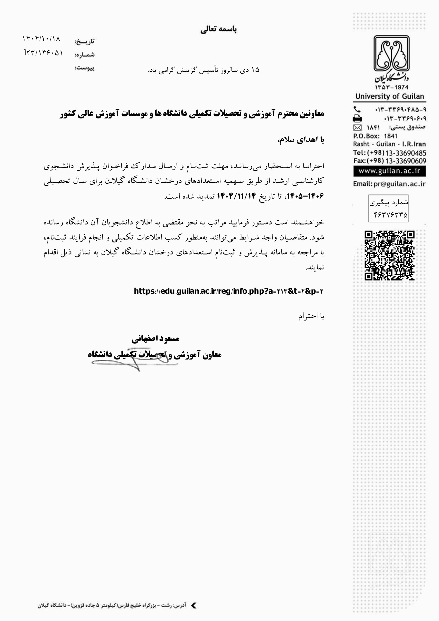 - تمدید فراخوان پذیرش بدون آزمون مقطع کارشناسی ارشد دانشگاه گیلان برای سال تحصیلی ۰۶-۱۴۰۵