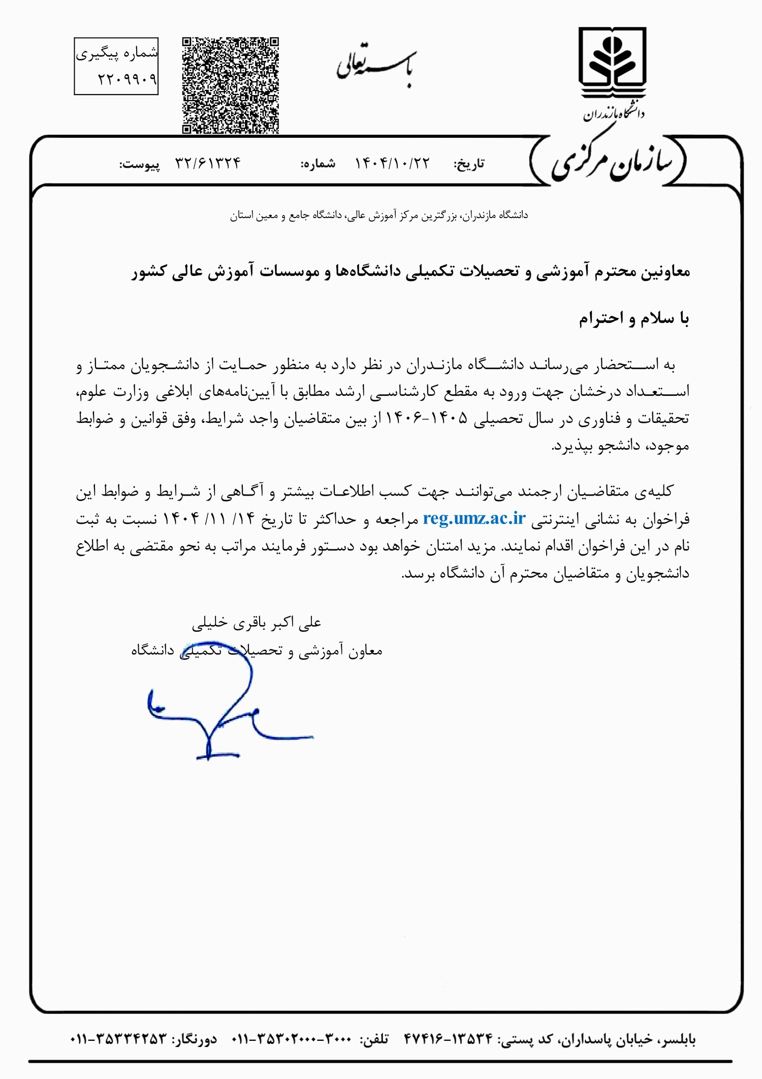 - فراخوان پذیرش بدون آزمون مقطع کارشناسی ارشد دانشگاه مازندران برای سال تحصیلی ۰۶-۱۴۰۵