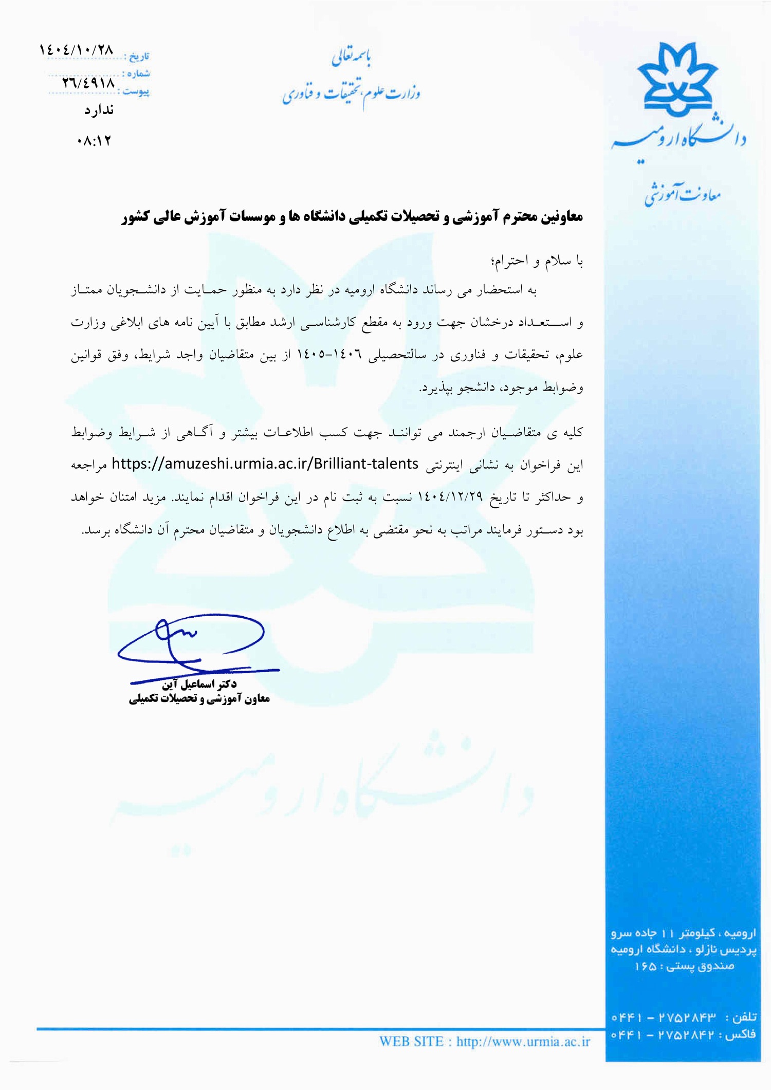 - فراخوان پذیرش بدون آزمون مقطع کارشناسی ارشد دانشگاه ارومیه برای سال تحصیلی ۰۶-۱۴۰۵