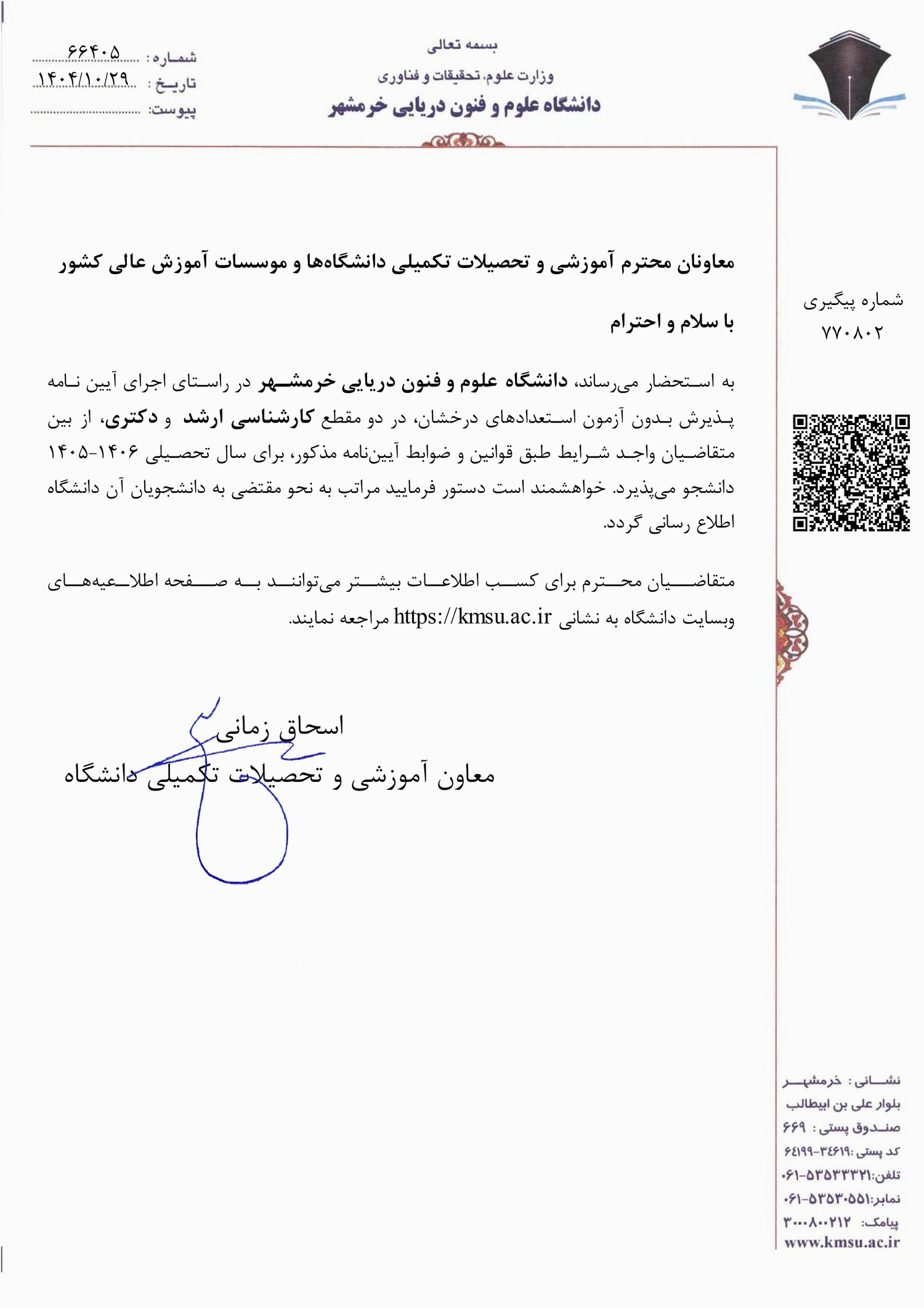 - فراخوان پذیرش بدون آزمون مقطع کارشناسی ارشد و دکتری دانشگاه علوم و فنون دریایی خرمشهر برای سال تحصیلی ۰۶-۱۴۰۵