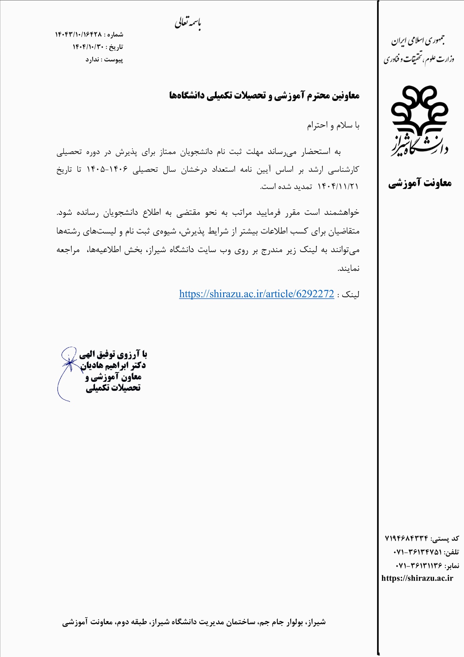- تمدید فراخوان پذیرش بدون آزمون مقطع کارشناسی ارشد دانشگاه شیراز برای سال تحصیلی ۰۶-۱۴۰۵
