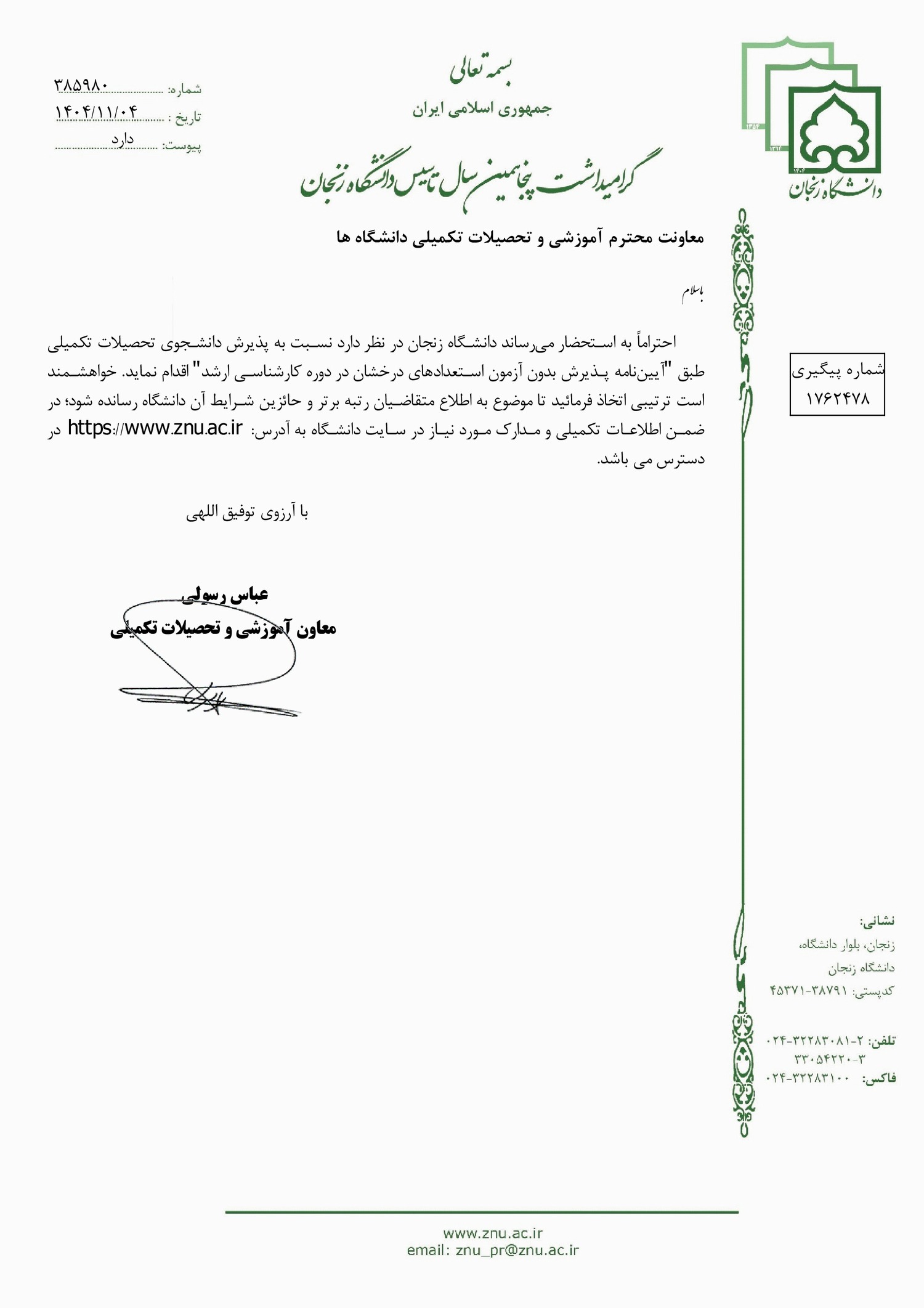 - تمدید فراخوان پذیرش بدون آزمون مقطع کارشناسی ارشد دانشگاه زنجان برای سال تحصیلی ۰۶-۱۴۰۵