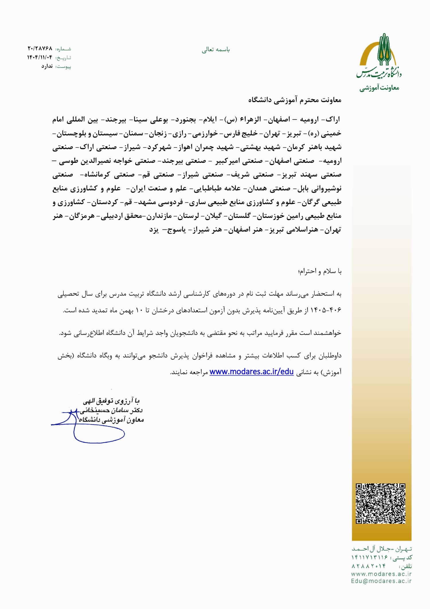 - تمدید فراخوان پذیرش بدون آزمون مقطع کارشناسی ارشد دانشگاه تربیت مدرس برای سال تحصیلی ۰۶-۱۴۰۵
