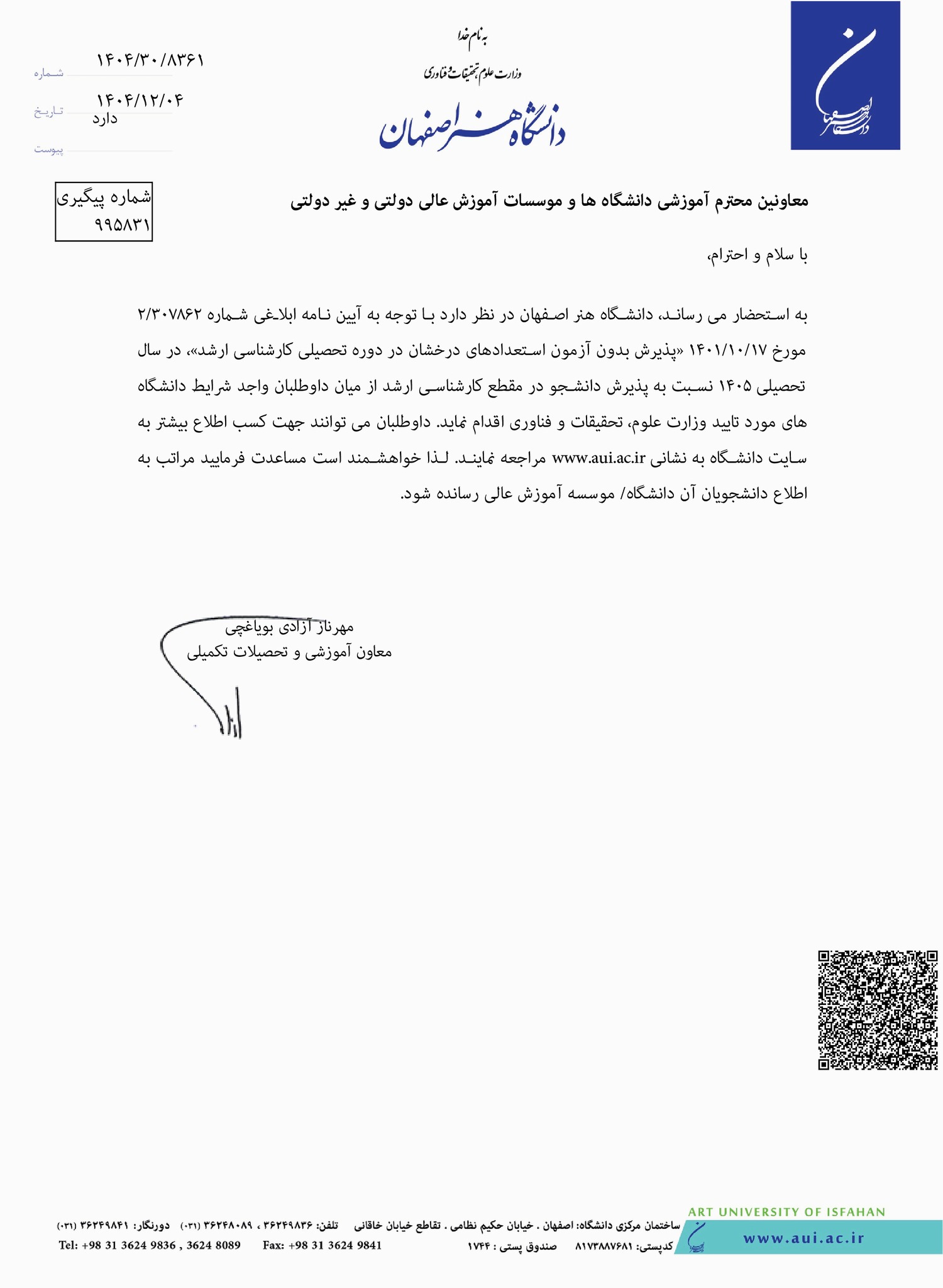 - فراخوان پذیرش بدون آزمون مقطع کارشناسی ارشد دانشگاه هنر اصفهان برای سال تحصیلی ۰۶-۱۴۰۵