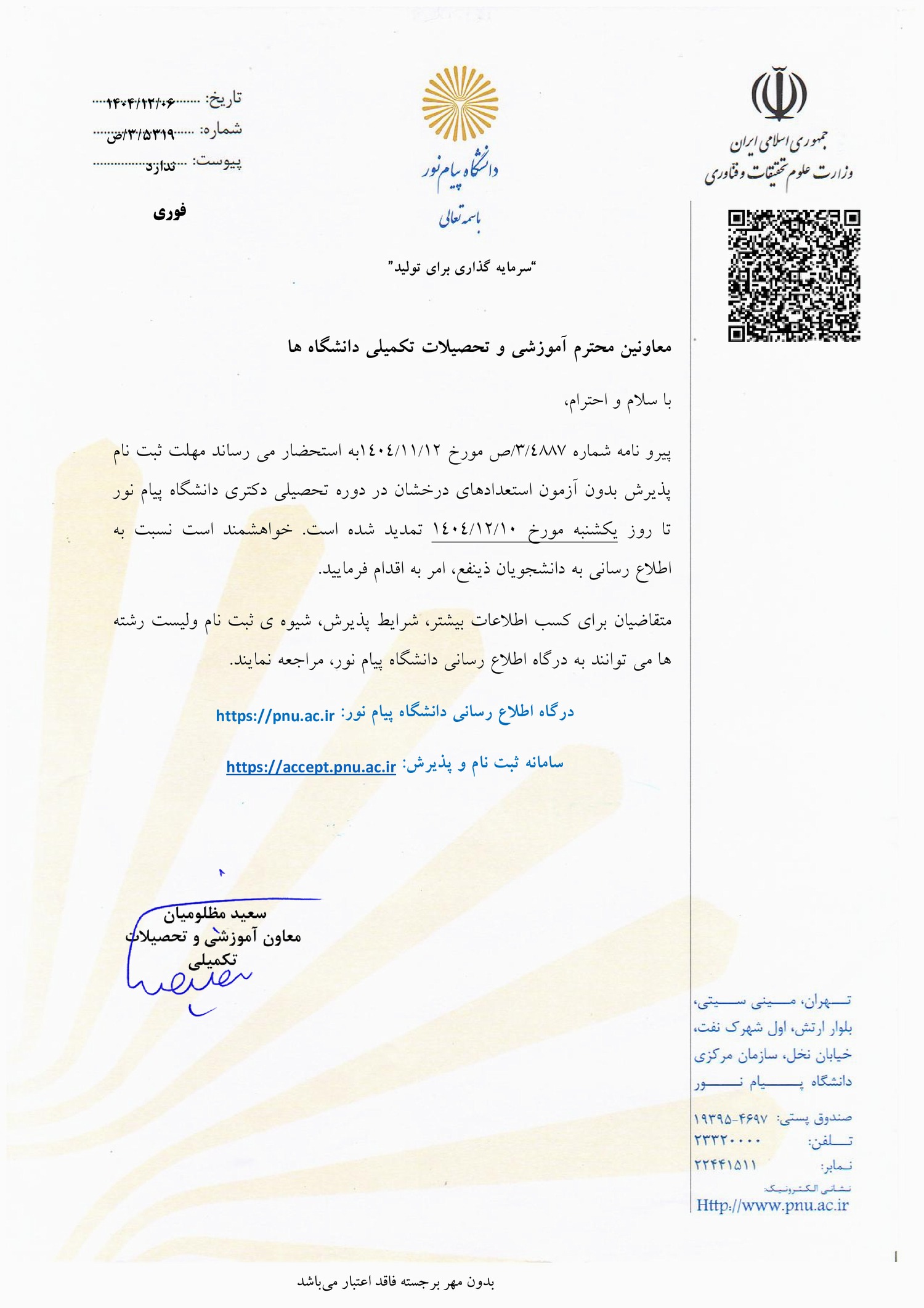- تمدید فراخوان پذیرش بدون آزمون مقطع دکتری دانشگاه پیام نور برای سال تحصیلی ۰۶-۱۴۰۵