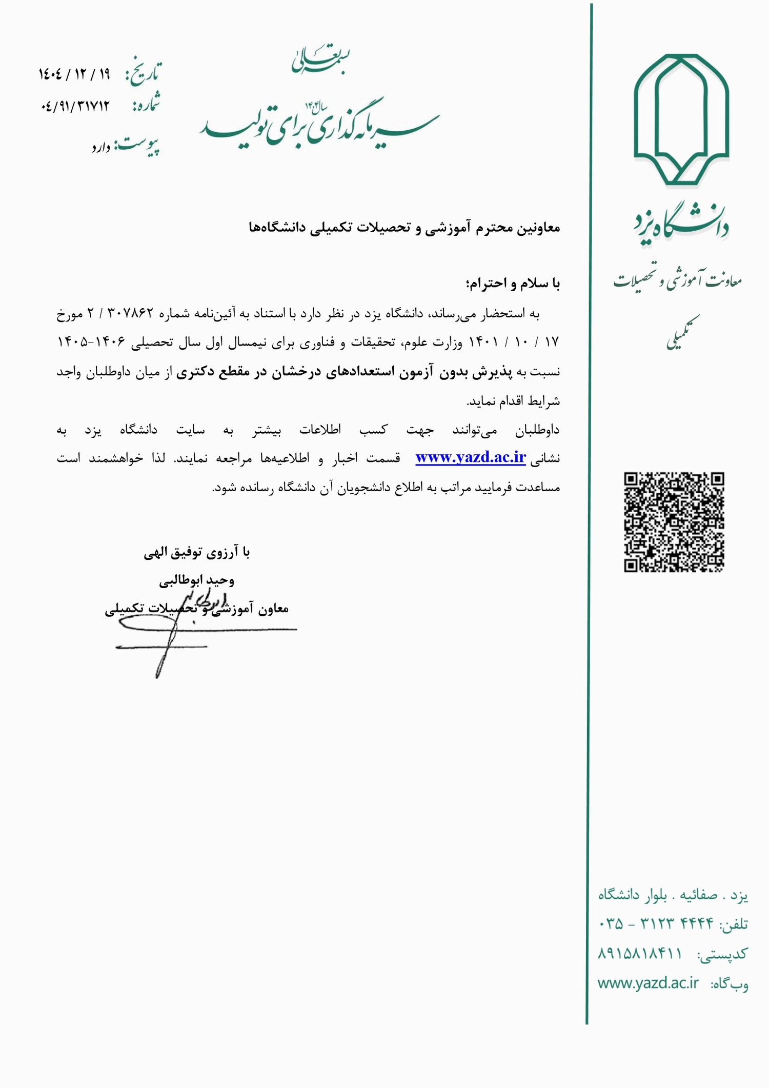 - فراخوان پذیرش بدون آزمون مقطع دکتری دانشگاه یزد برای سال تحصیلی ۰۶-۱۴۰۵