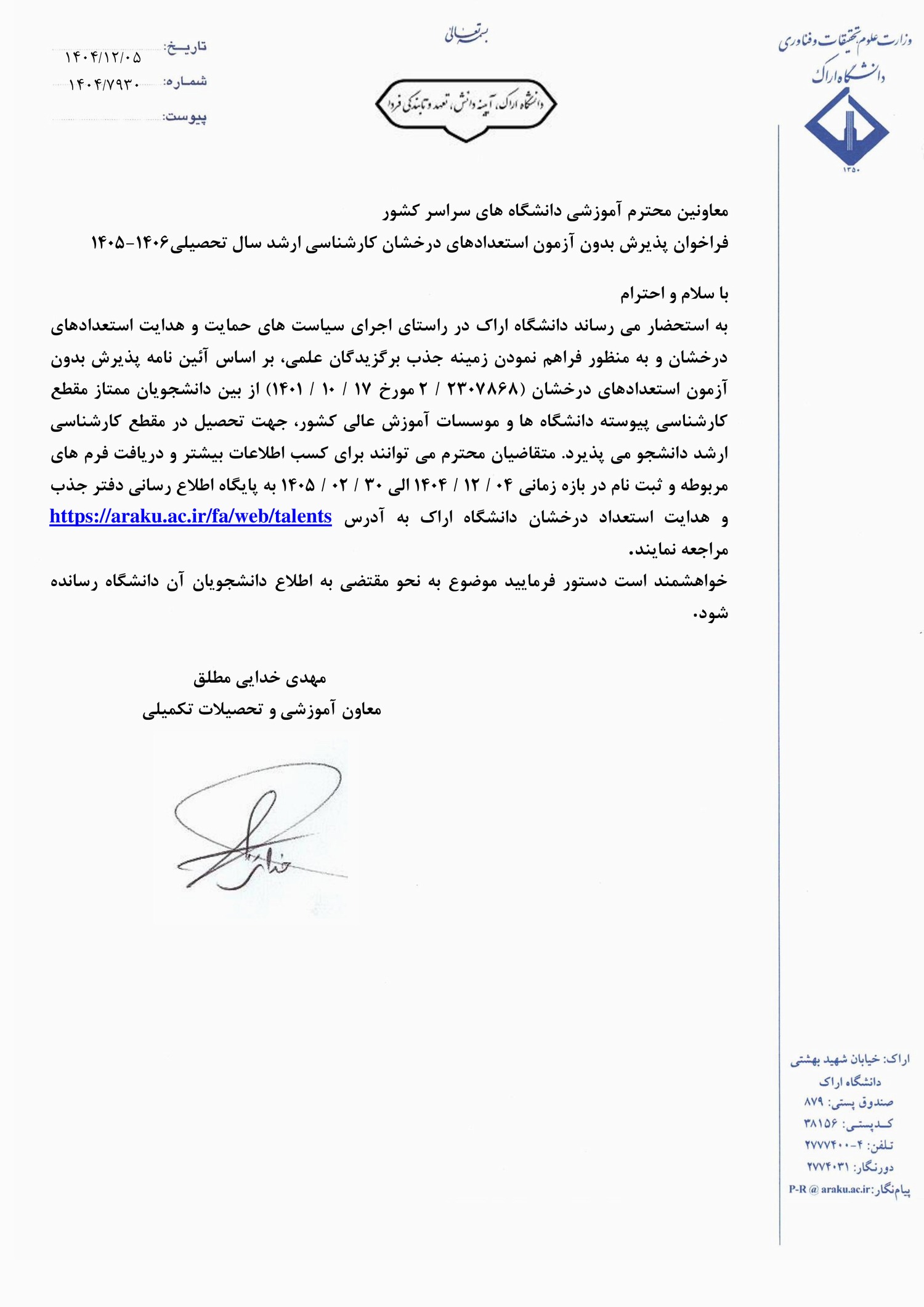 - فراخوان پذیرش بدون آزمون مقطع کارشناسی ارشد دانشگاه اراک برای سال تحصیلی ۰۶-۱۴۰۵