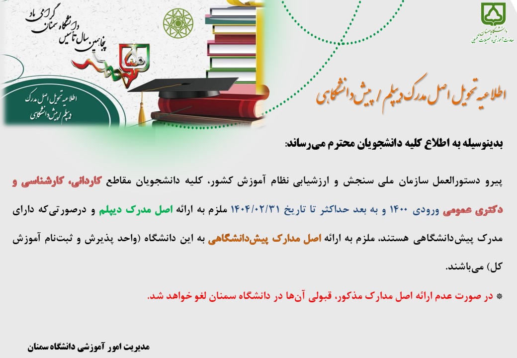 اطلاعیه تحویل اصل مدرک دیپلم⁄ پیشدانشگاهی