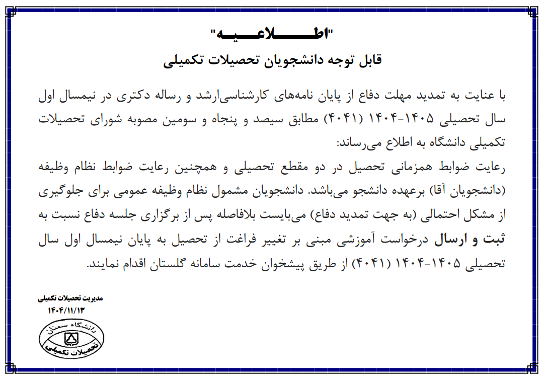 اطلاعیه ویژه دانشجویان مقاطع تحصیلات تکمیلی دانشگاه سمنان 1404/11/14 - 07:43 تعداد بازدید: 280 کلمات کلیدی