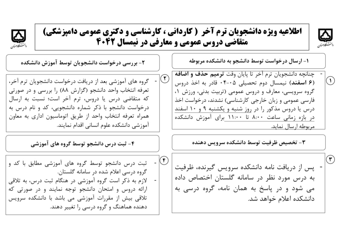 اطلاعیه اصلاحات ترم آخر نیمسال دوم 1405 1404 قابل توجه دانشجویان ترم آخر مقاطع کاردانی، کارشناسی و دکتری عمومی دامپزشکی 1404/12/08 - 23:39 تعداد بازدید: 124 کلمات کلیدی