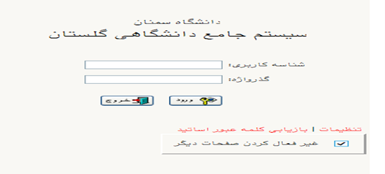 در هنگام ورود به سامانه گلستان در صورتی‌که با پیغام خطای "بیش از حدمجاز نمی‌توانید از امکانات استفاده نمایید" مواجه شدید در صفحه شناسه کاربری و گذرواژه آیتم تنظیمات - غیرفعال کردن صفحات دیگر را انتخاب کنید و سپس با ورود شناسه کاربری و گذرواژه وارد سامانه شوید.