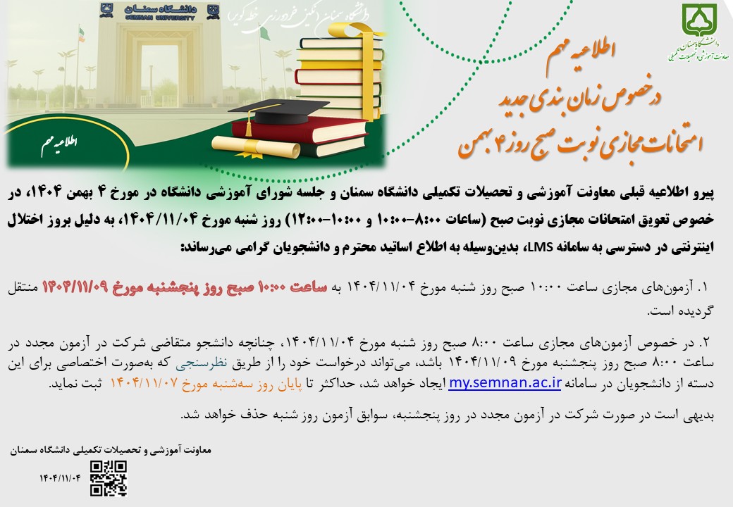 اطلاعیه مهم درخصوص زمانبندی جدید امتحانات مجازی نوبت صبح روز ۴ بهمن 1404/11/04 - 22:16 تعداد بازدید: 132 کلمات کلیدی