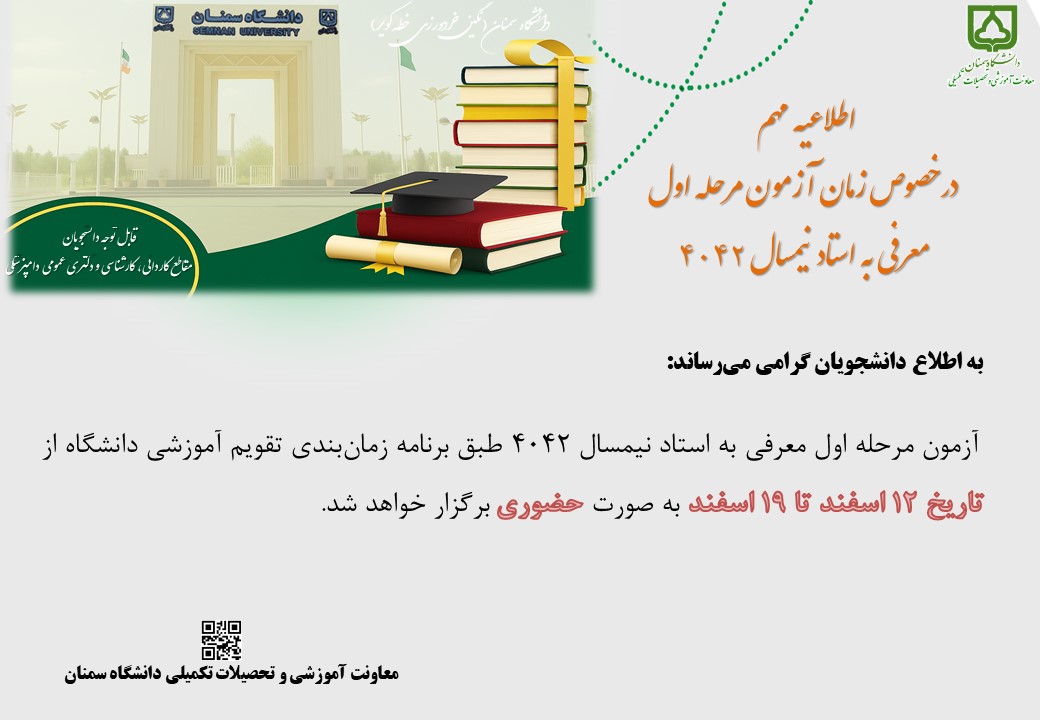 اطلاعیه مهم درخصوص زمان آزمون مرحله اول معرفی به استاد نیمسال 4042 1404/11/21 - 19:10 تعداد بازدید: 89 کلمات کلیدی