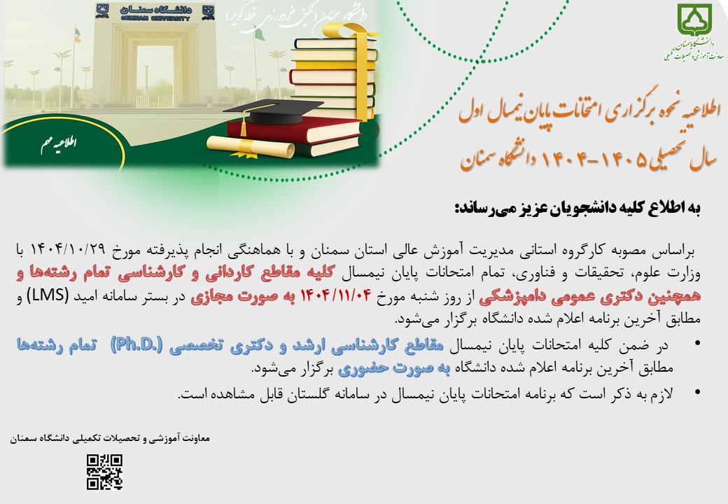 اطلاعیه نحوه برگزاری امتحانات پایان نیمسال اول سال تحصیلی 1405 1404 دانشگاه سمنان 1404/10/29 - 16:17 تعداد بازدید: 2827 کلمات کلیدی