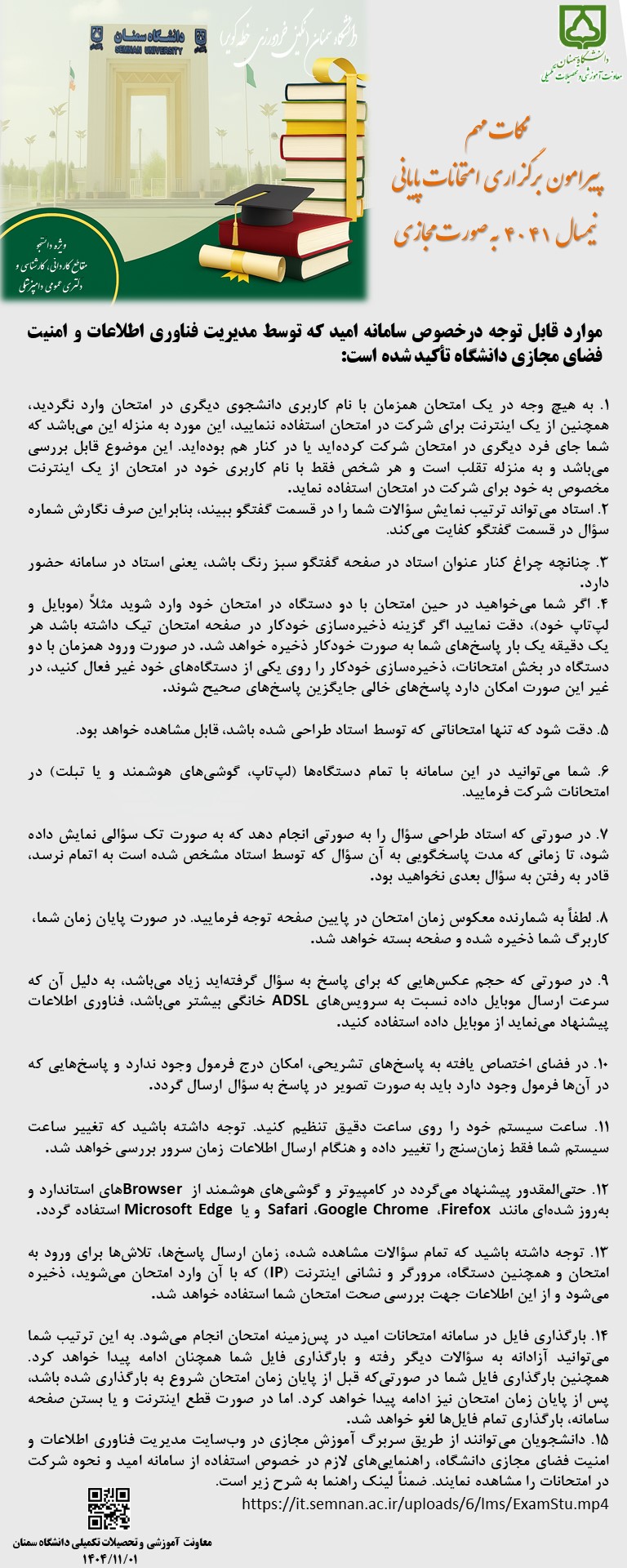 اطلاعیه نکات مهم پیرامون برگزاری امتحانات پایانی نیمسال 4041 به صورت مجازی 1404/10/30 - 13:24 تعداد بازدید: 624 کلمات کلیدی