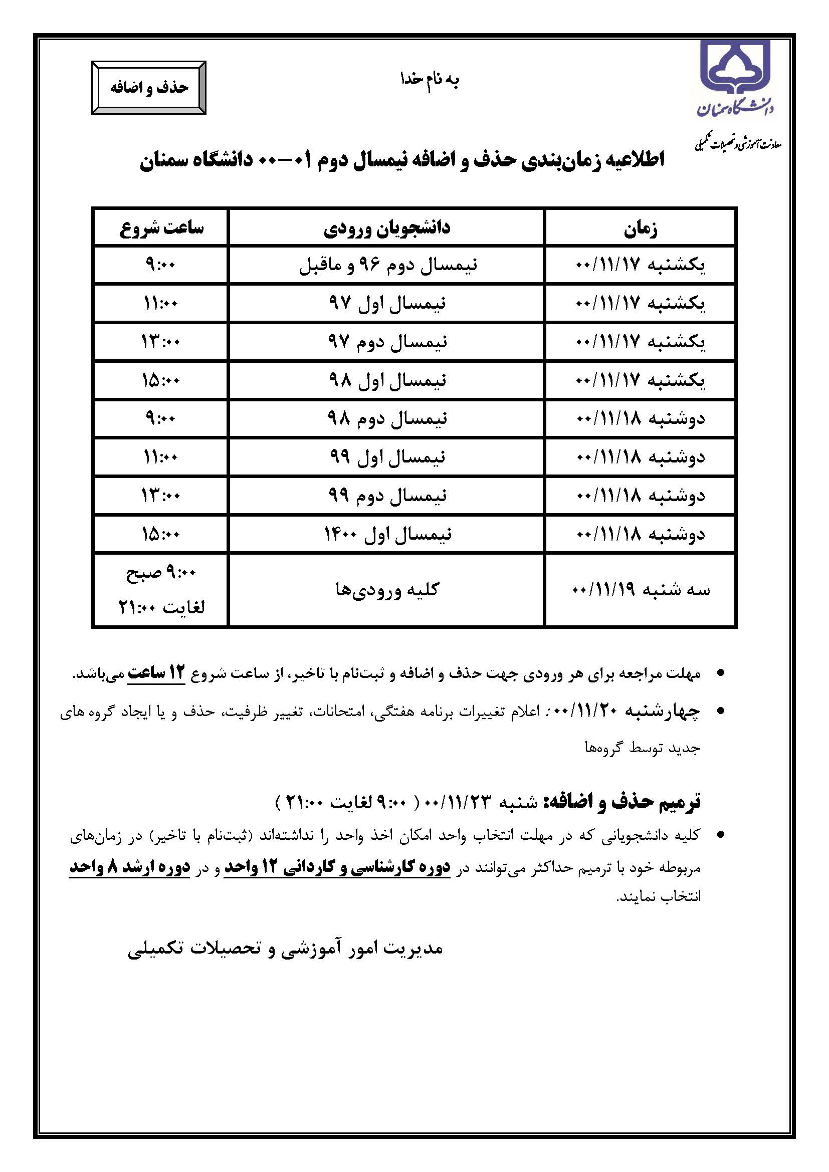 زمان بندی حذف و اضافه نیمسال 4002 // - 23:00 تعداد بازدید: 2817 زمان بندی حذف و اضافه نیمسال 4002 کلمات کلیدی