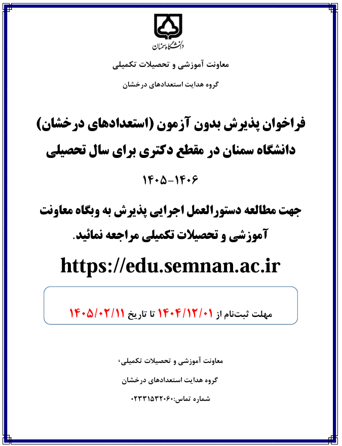 مطابق ضوابط وزارت علوم، تحقیقات و فناوری در خصوص حمایت و هدایت استعدادهای درخشان، دانشگاه سمنان در نظر دارد از میان دانشجویان و دانشآموختگان ممتاز مقطع کارشناسیارشد دانشگاههای کشور تعدادی را برای تحصیل در مقطع دکتری سال تحصیلی ۱۴۰5-۱۴۰6 به صورت بدون آزمون پذیرش نماید. جهت کسب اطلاعات بیشتر به دستورالعمل اجرایی مربوطه که به پیوست آمده است، مراجعه نمایید. ضمنا، مهلت ثبت درخواست از تاریخ 01/12/1404 تا تاریخ 11/02/1405 میباشد.