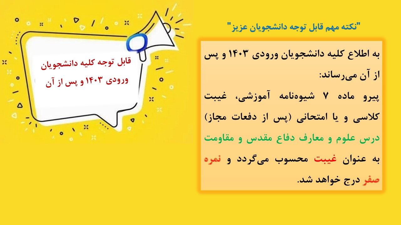 نکته مهم قابل توجه کلیه دانشجویان ورودی 1403 و پس از آن در خصوص درس «علوم و معارف دفاع مقدس و مقاومت» 1404/07/02 - 09:08 تعداد بازدید: 64 کلمات کلیدی